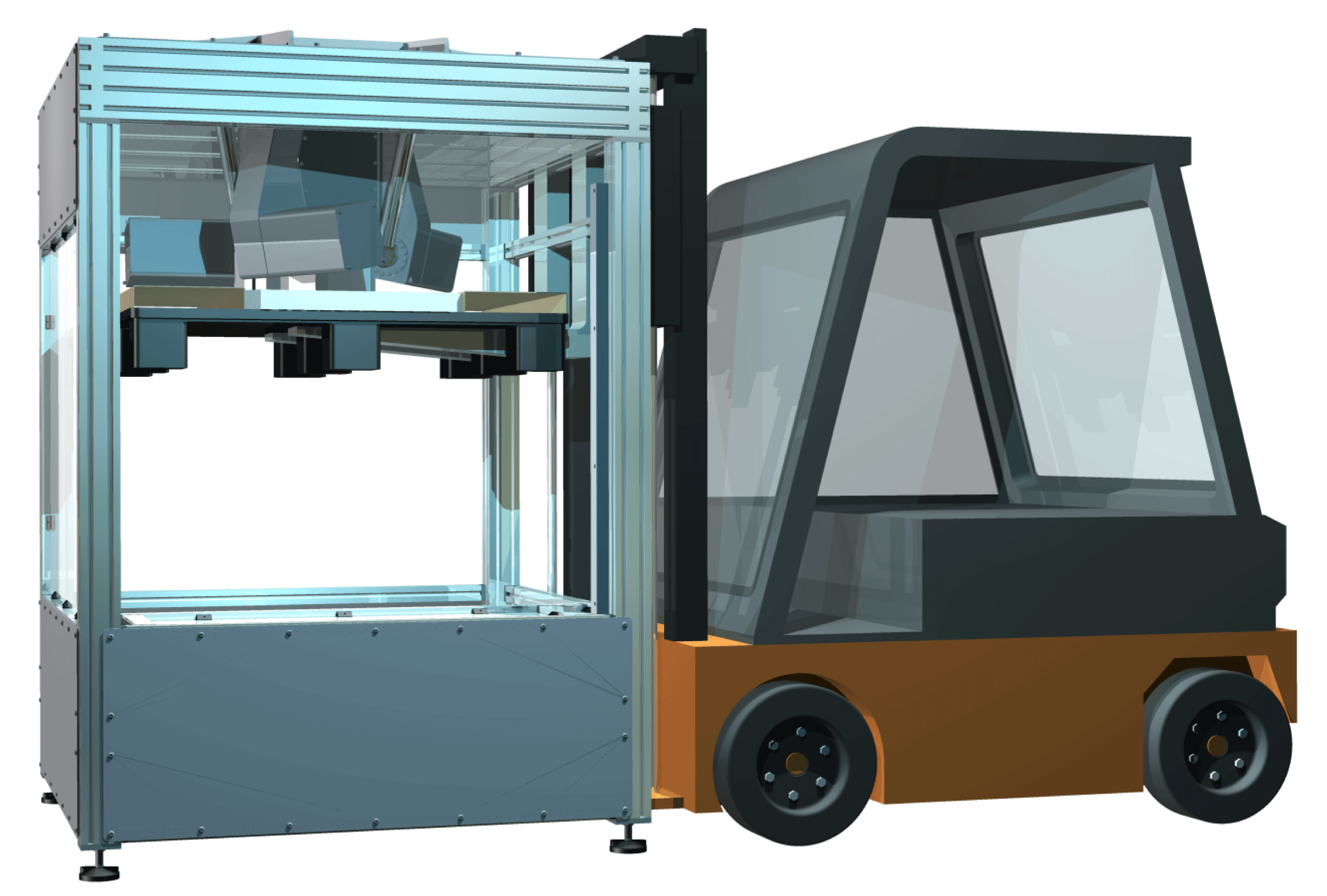 Using a forklift truck, lift the robot and the pallet into the enclosure.