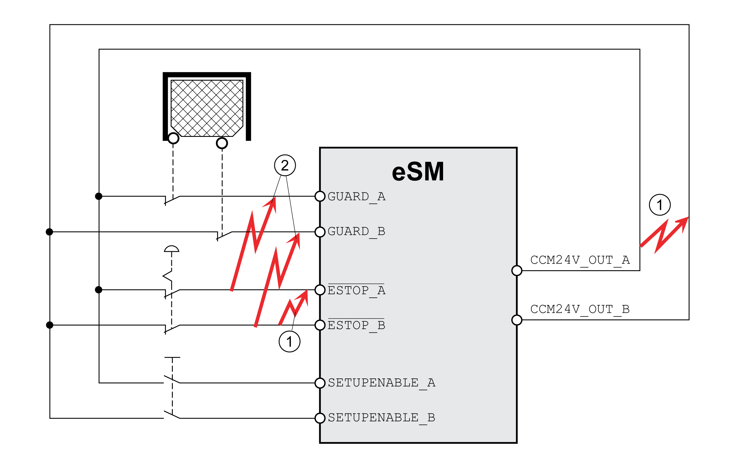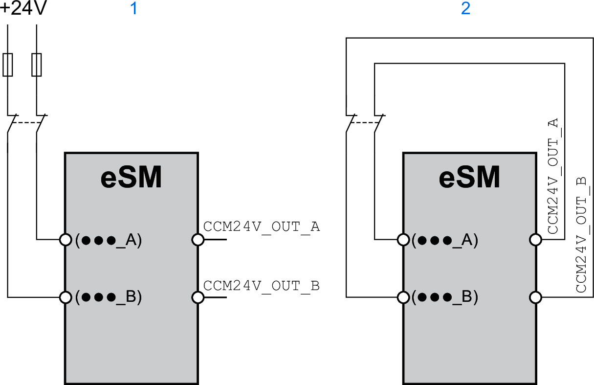 The outputs CCM24V_OUT_A and CCM24V_OUT_B of the safety module eSM provide 24 Vdc supply voltage with cross circuit detection for input devices/sensors with relay output contacts. In the case of dual-channel wiring and supply of the input devices/sensors via CCM24V_OUT_A and CCM24V_OUT_B, cross circuits between channels and short circuits to other conductors can be detected.