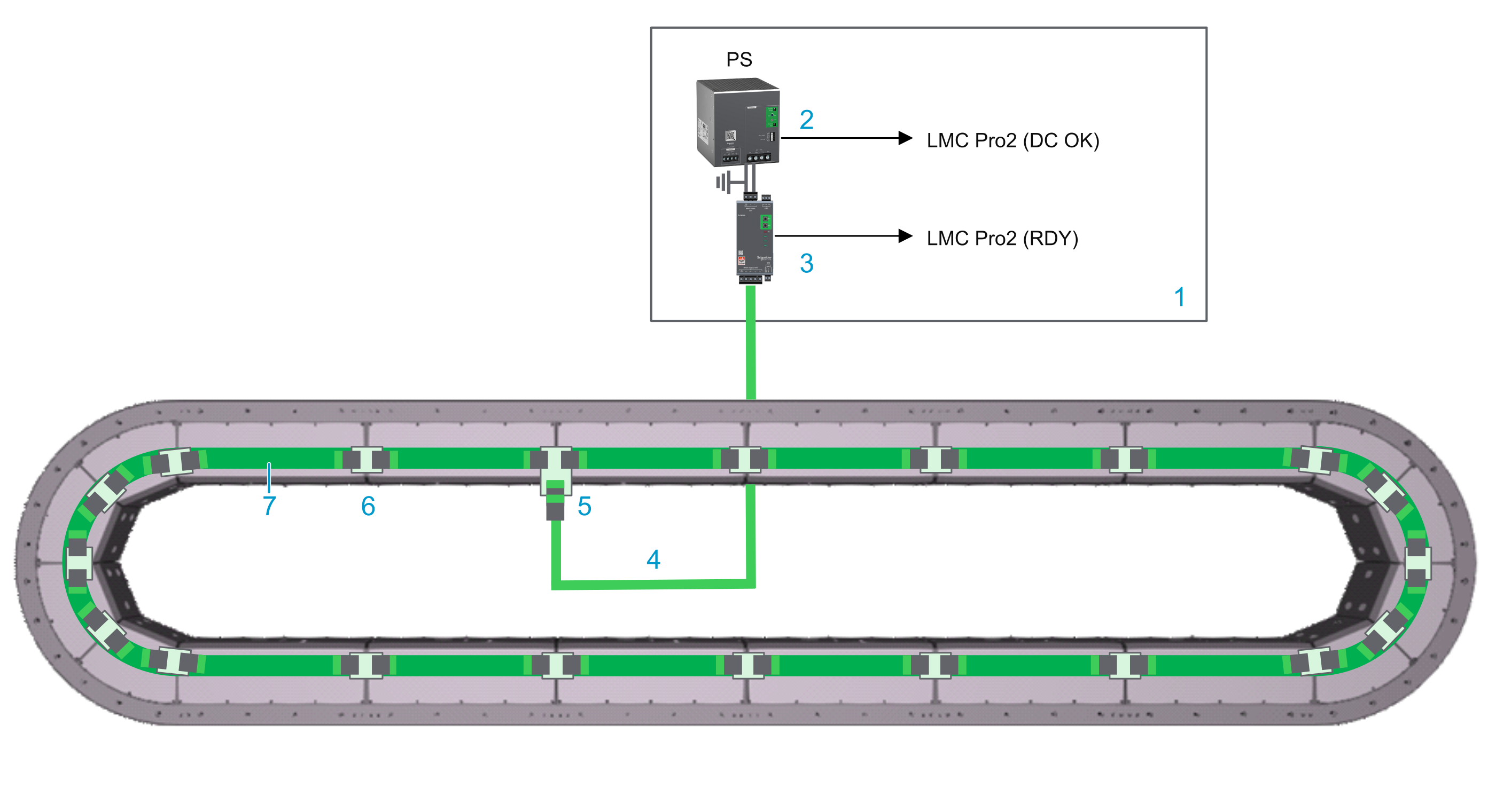 The Lexium™ MC connection module (3) supplies the Lexium™ MC12 multi carrier track with power (DC bus)