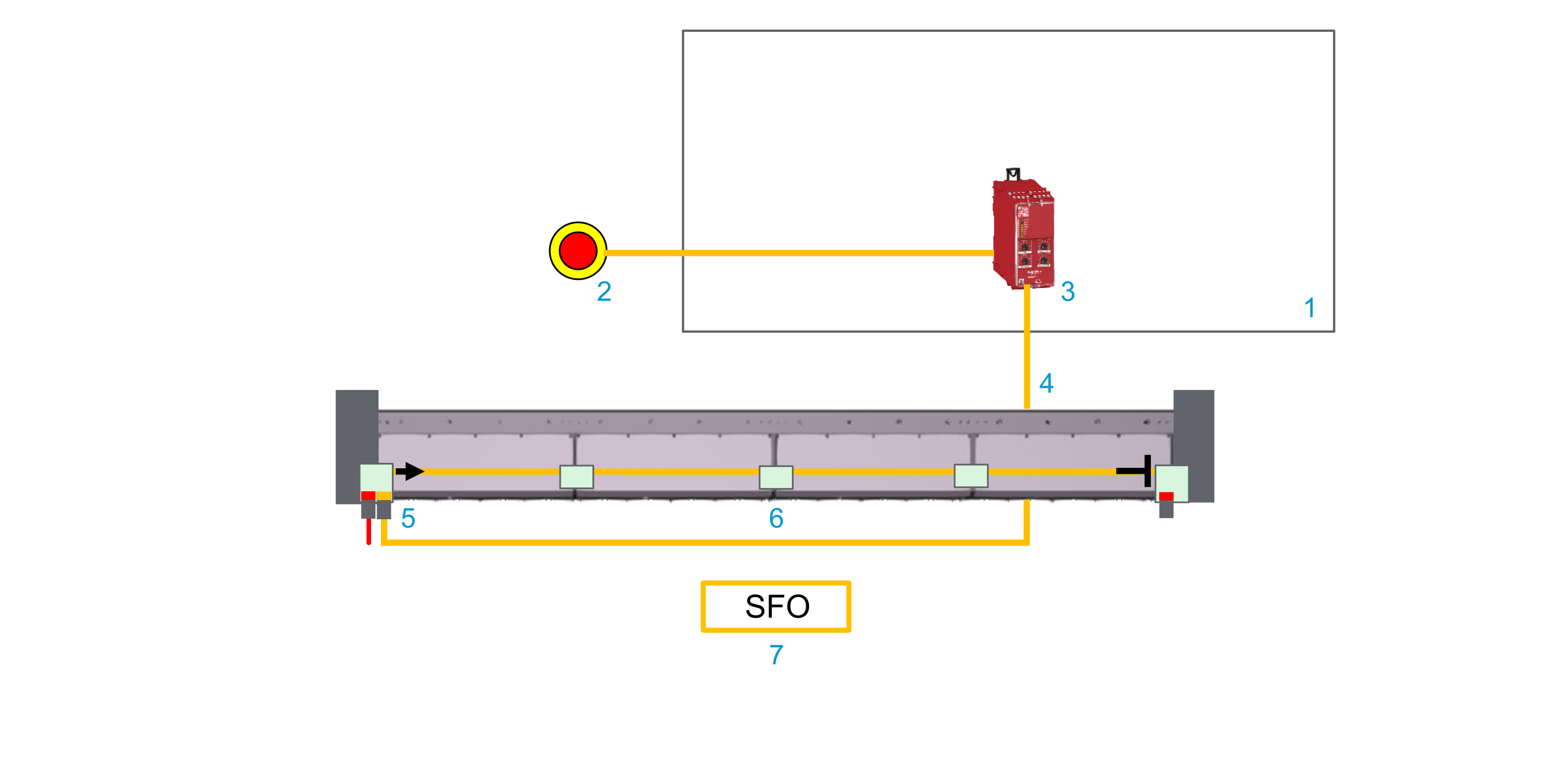 The function is activated/deactivated via a signal (pair) which is feed in via a Lexium™ MC communication interconnect with SFO connector at a freely selectable Lexium™ MC12 long stator motor segment straight or Lexium™ MC12 long stator motor segment arc. The signal is forwarded with the Lexium™ MC communication interconnects to all segments belonging to the same SFO group.