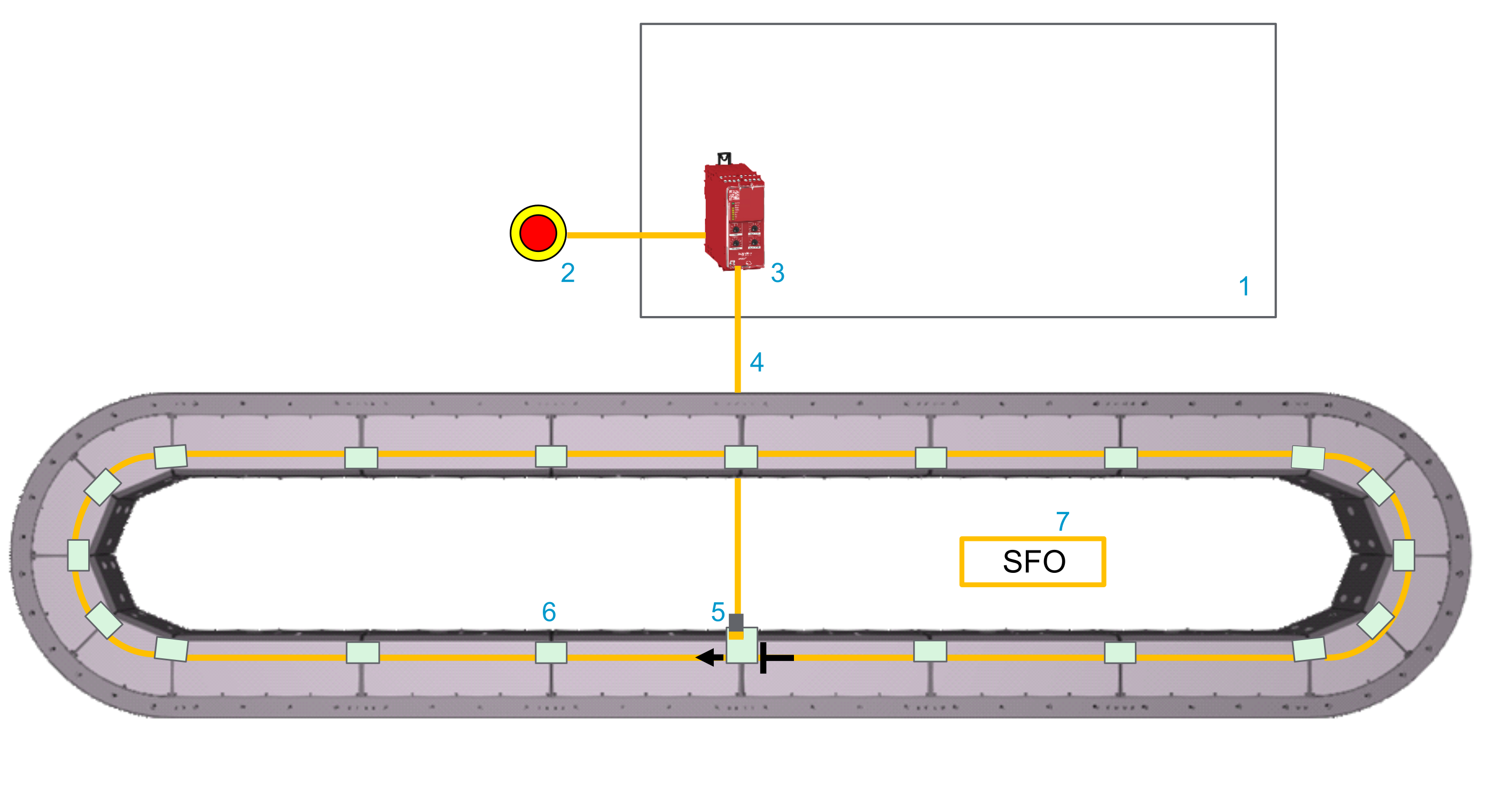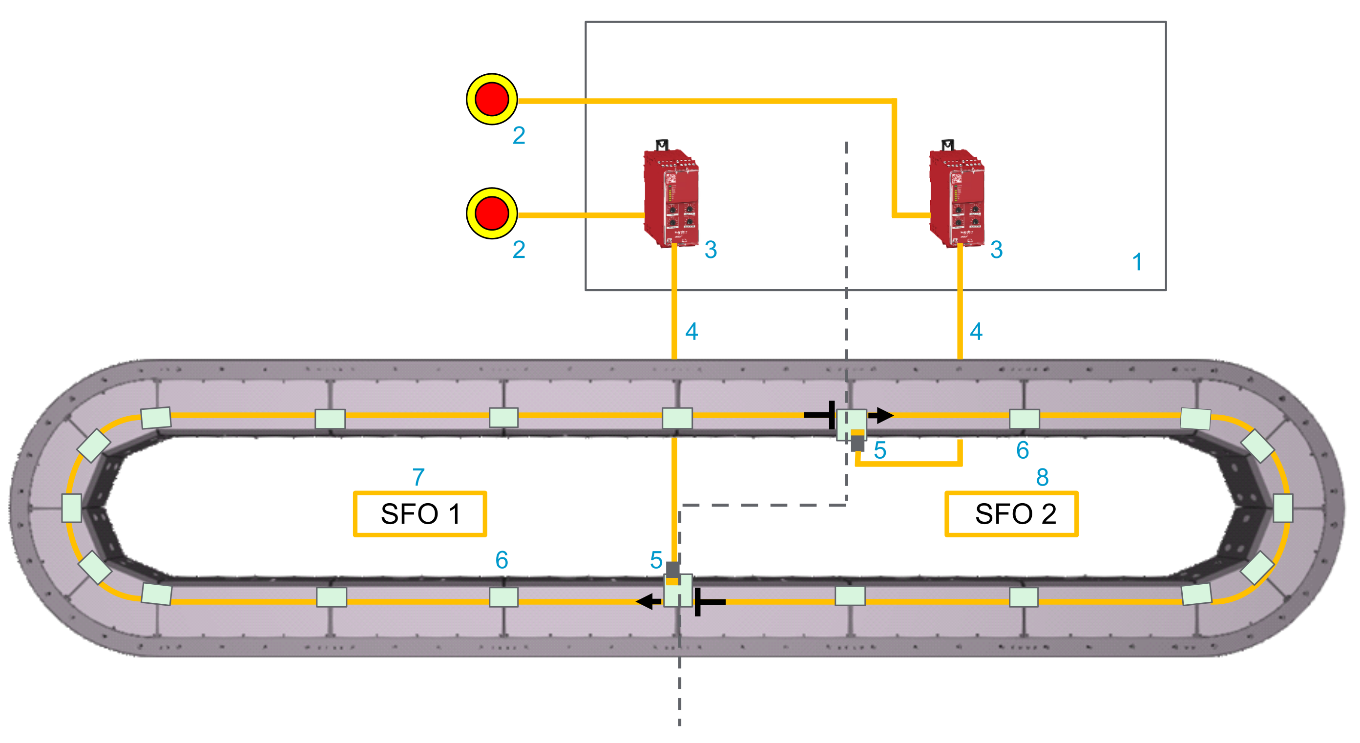 Example: The segments of a closed track belong to two different SFO groups with the SFO function. This means that the segments of SFO group 1 and SFO group 2 can be de-energized independently of each other. If you de-energize SFO group 1, you must be aware that the carriers of the SFO group 2 can still roll into SFO group 1 and vice versa.