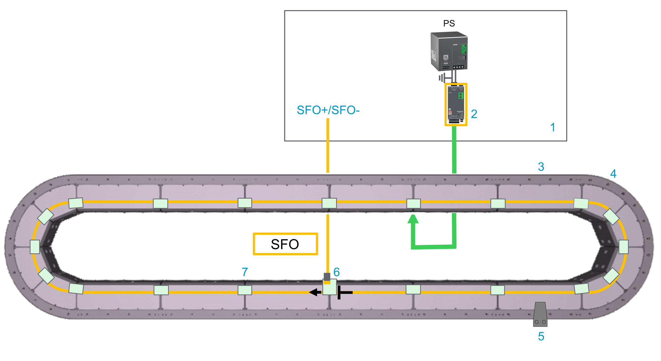 Several SFO groups can be set up for different sections of the track. An SFO group always starts at the Lexium™ MC communication interconnect with SFO connector and extends clockwise to the next Lexium™ MC12 long stator motor segment via the Lexium™ MC communication interconnect.