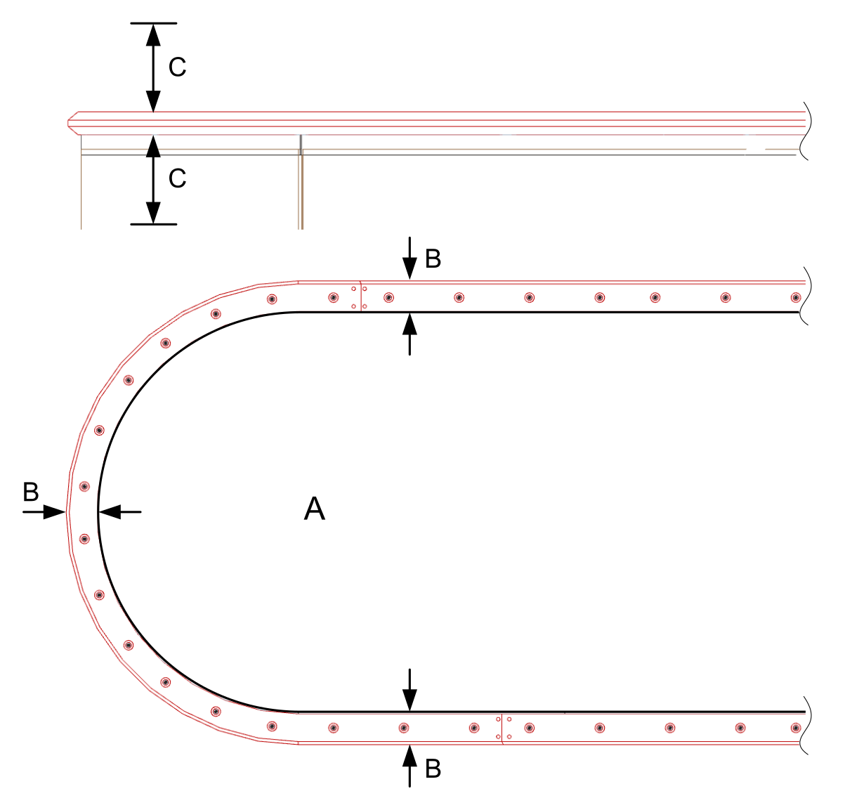 A working space (C) of about 100 mm (3.94 in) must be available above and below the rails.