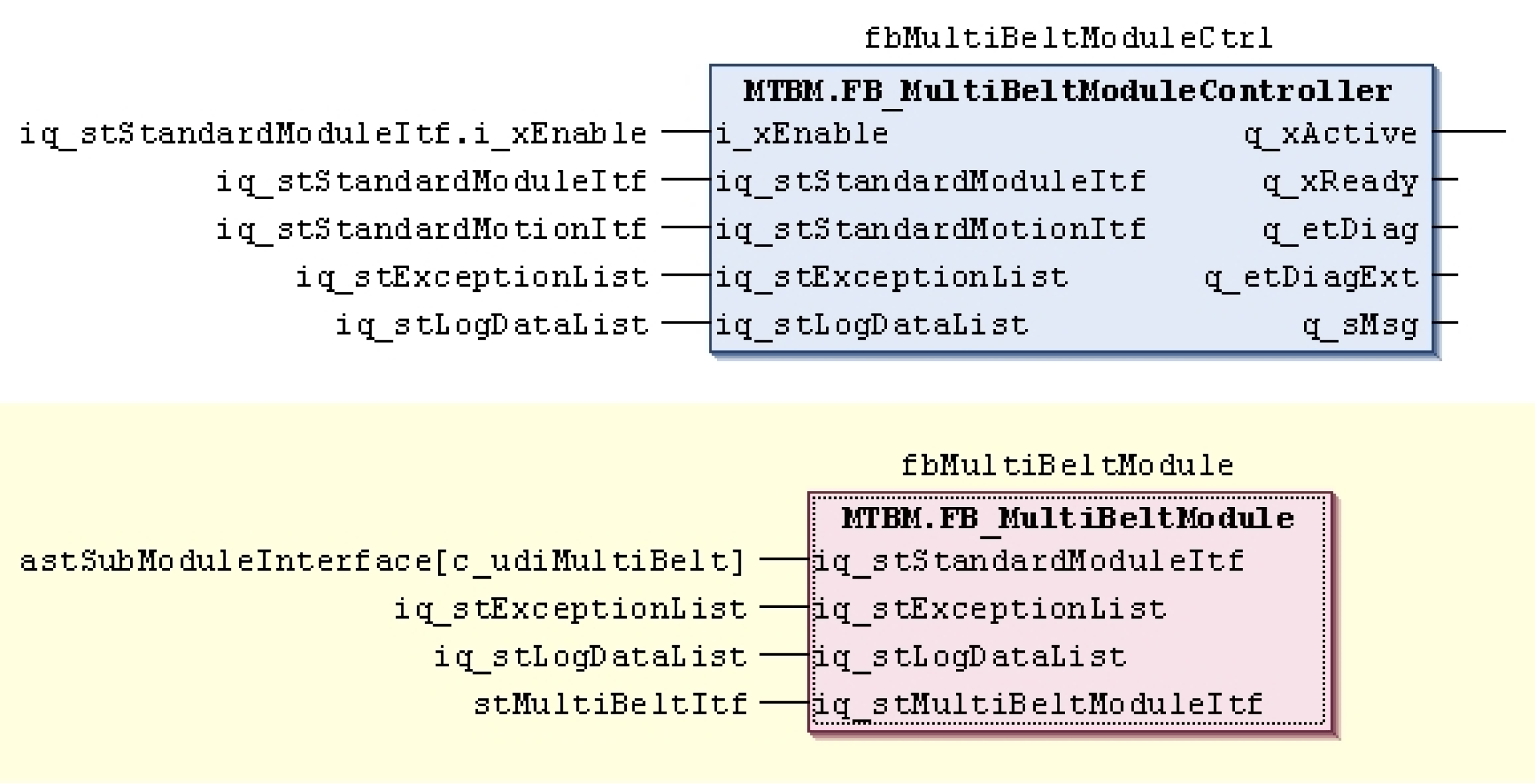 fbMultiBeltModuleCtrl and fbMultiBeltModule must be called up in the SubModules action of the node. Call up the controller before the module.