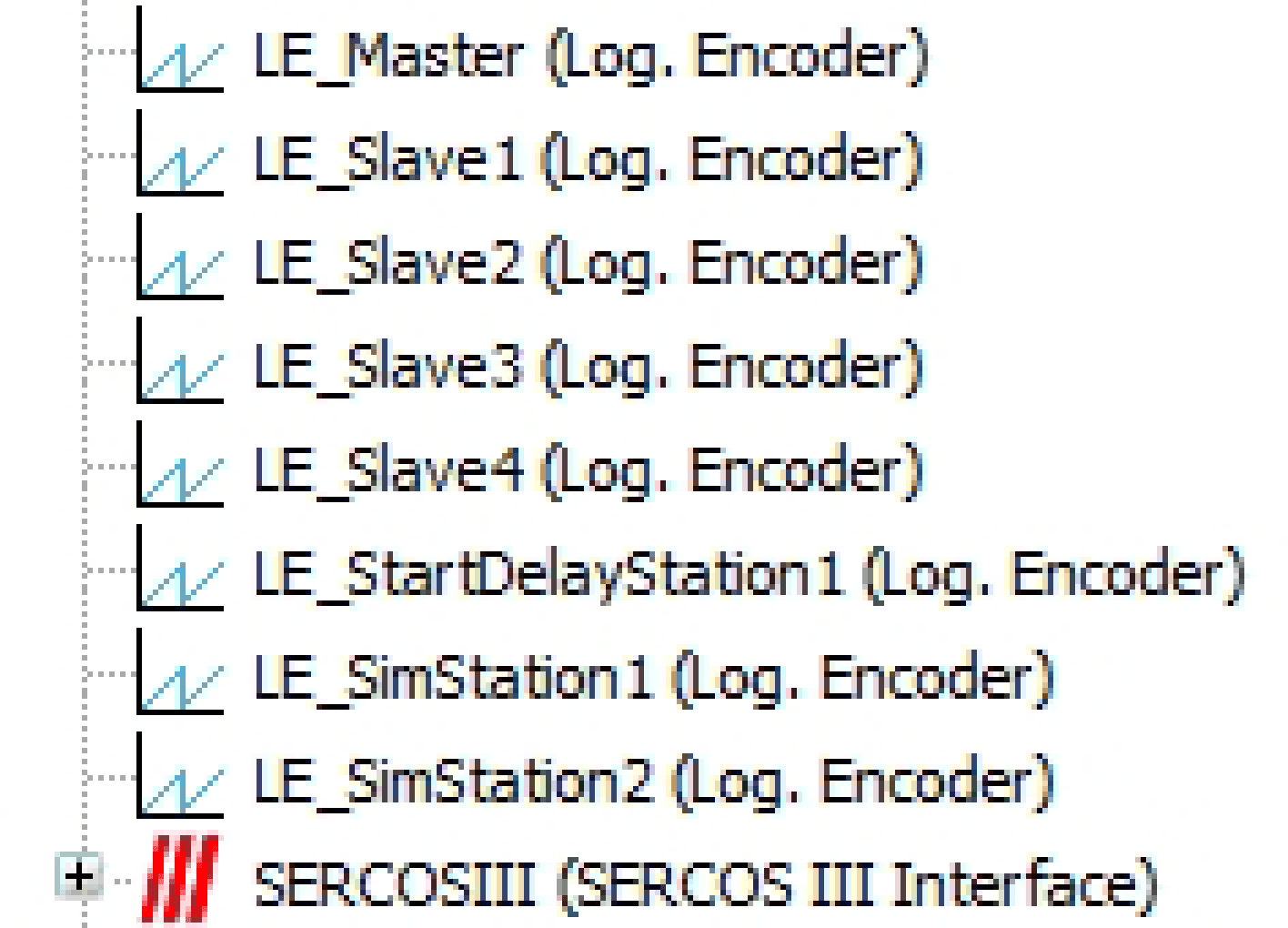 In the MultiBelt demo project, the designation for the axes of the trains is DRV_Train1 to DRV_Train4 and the designation of the logical encoder for the loading station is LE_StartDelayStation1. The designation of the logical encoder for the unloading station is LE_Master.