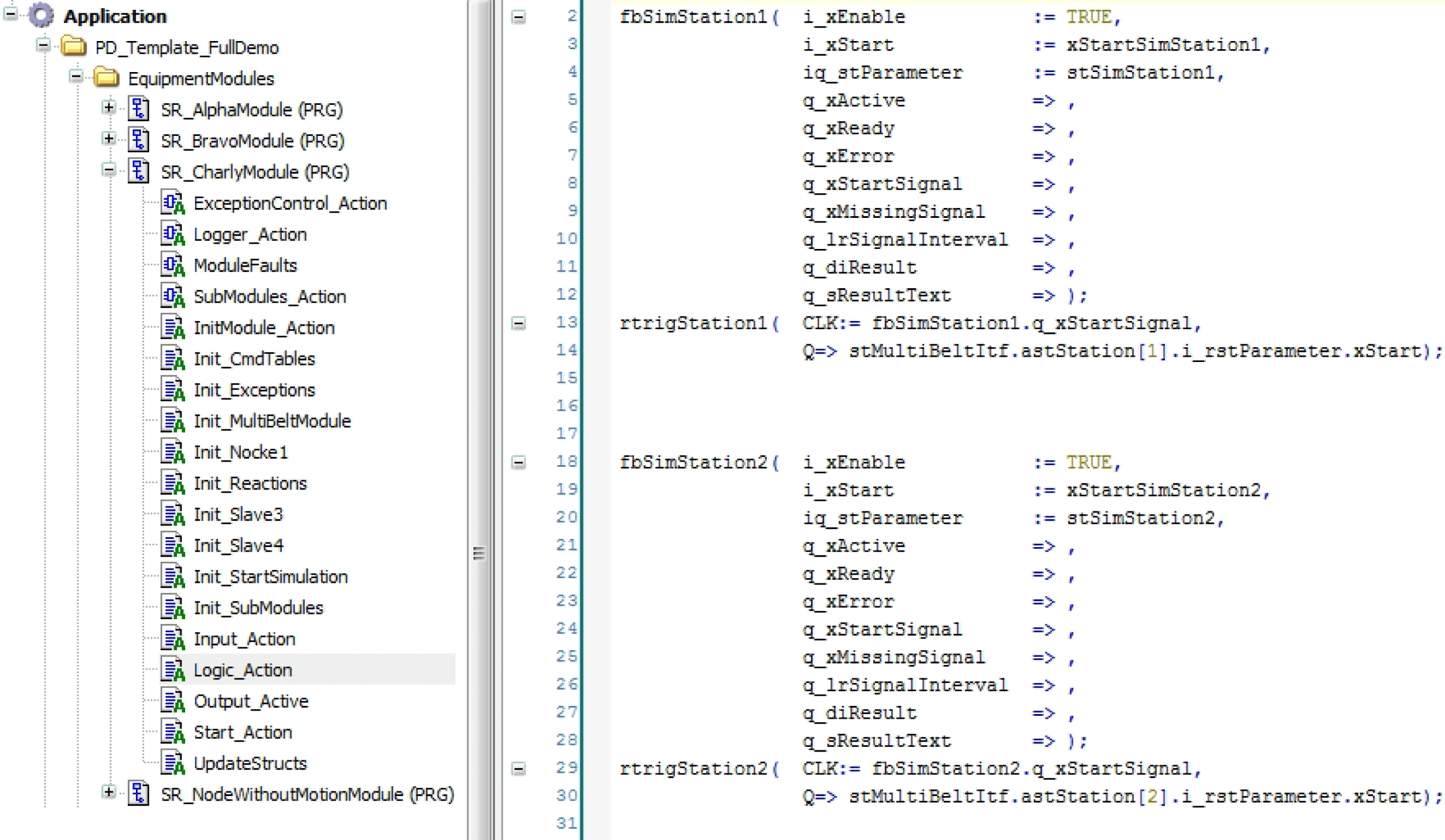 • Insert an action with the name Init_MultiBeltModule into the node of the module and call it up in the InitModule_Action step.