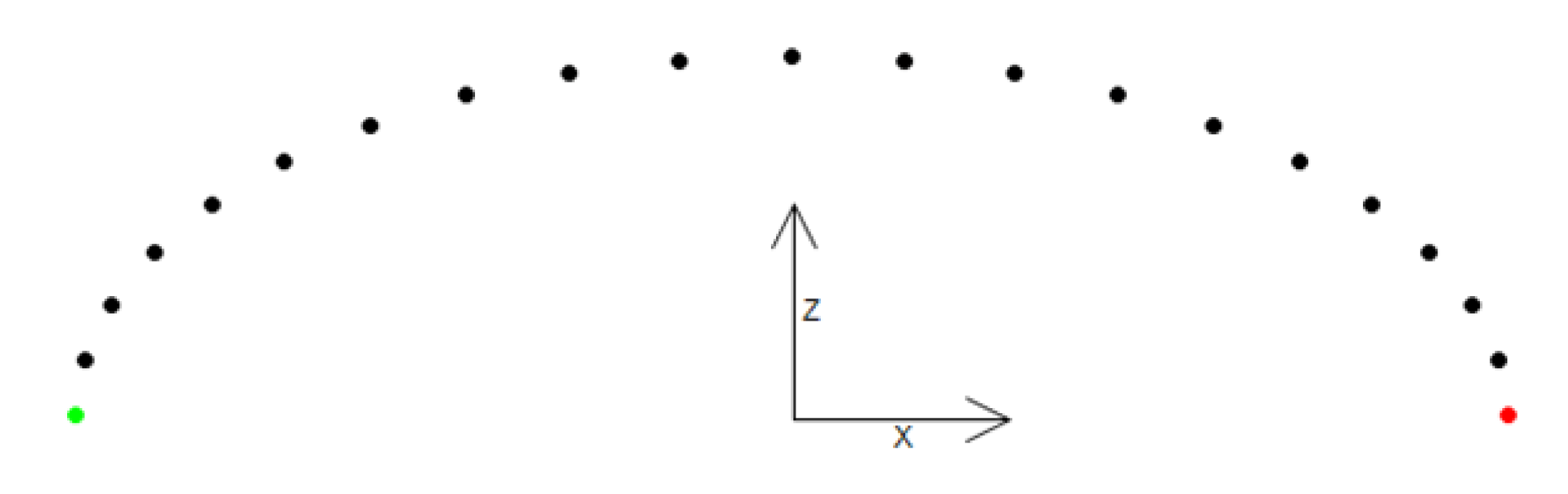 Based on the inputs i_stStart, i_stTarget, i_lrAbsHeight and on the value of the property udiNumberOfSplinePoints, this method calculates a position table for a spline interpolation in three-dimensional space. Traveling along these positions can be realized by using the IF_RobotMotion.MoveS motion command. A position table is calculated from the start position to the target position as well as from the target position to the start position. For this purpose, two ellipse-shaped half branches are calculated: from the start position to the apex and from the apex to the target position. The apex is calculated such that the bend of the two half branches in this point is equal.