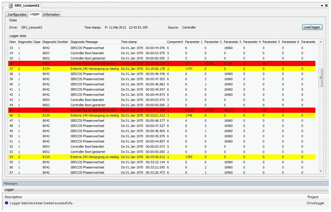 If an entry takes place in the Logger of the drive before this time, then the date and time cannot be saved for this message.