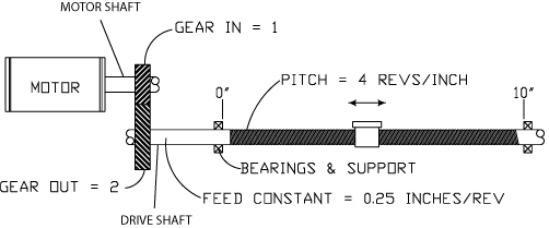 The ball screw spindle has a thread pitch of 0.25 inch per drive shaft revolution. The FeedConstant is therefore 0.25 and defines the units as inches.