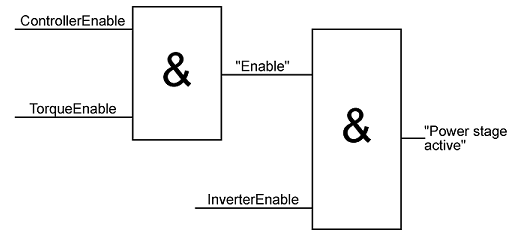 The following figure indicates the influence of ControllerEnable, TorqueEnable, and InverterEnable on the power stage release of the servo amplifier.