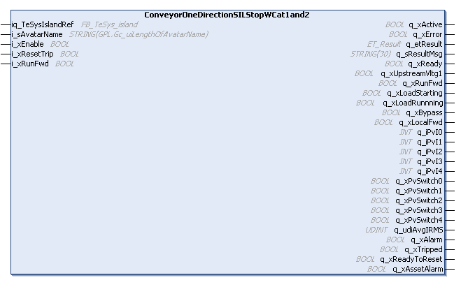El bloque de funciones ConveyorOneDirectionSILStopWCat1and2 permite gestionar una cinta transportadora en una dirección con las categorías de parada 0 o 1, la categoría de cableado 1 y la categoría 2.