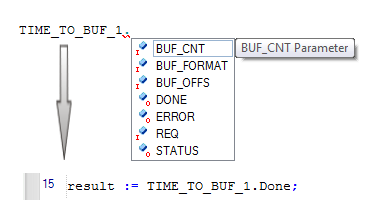 TIME_TO_BUF_1.DONE - 'DONE' is an output parameter of the user-defined 'TIME_TO_BUF' function block. The instance name of this function block in our example is TIME_TO_BUF_1.