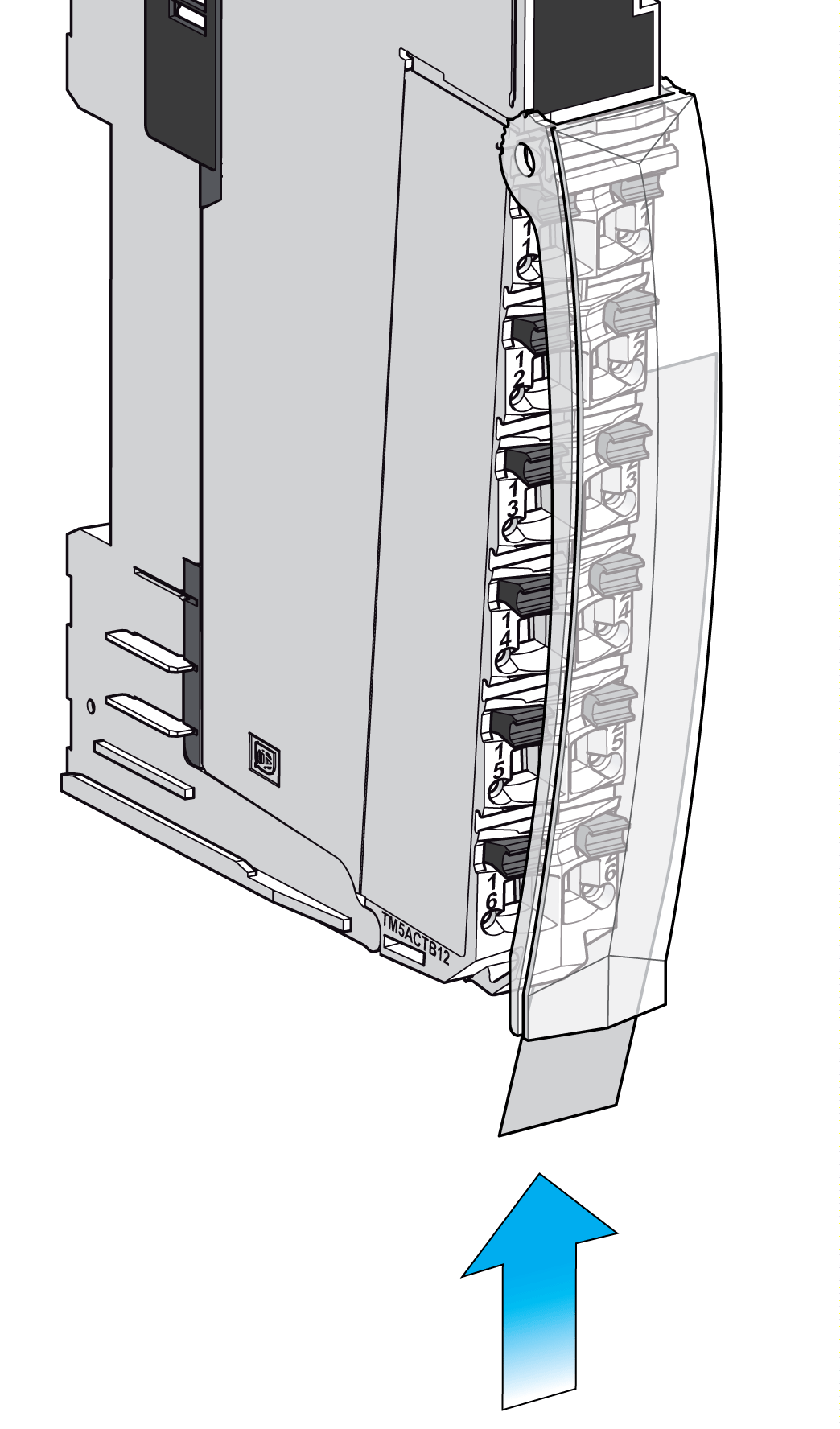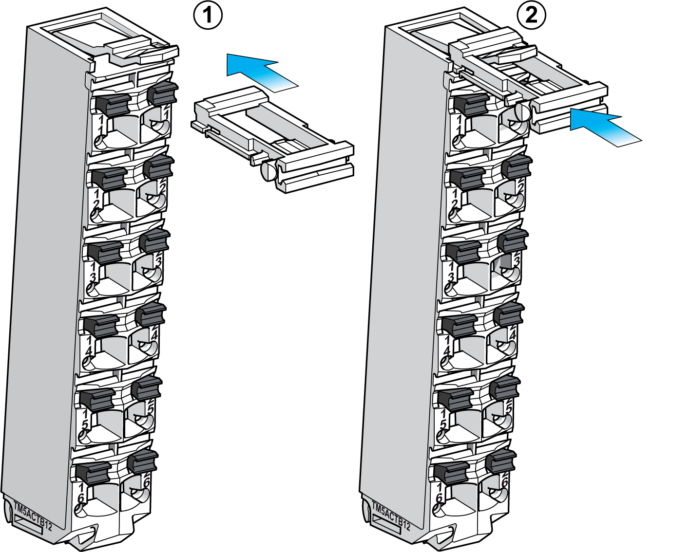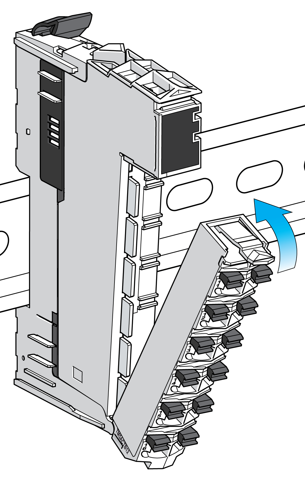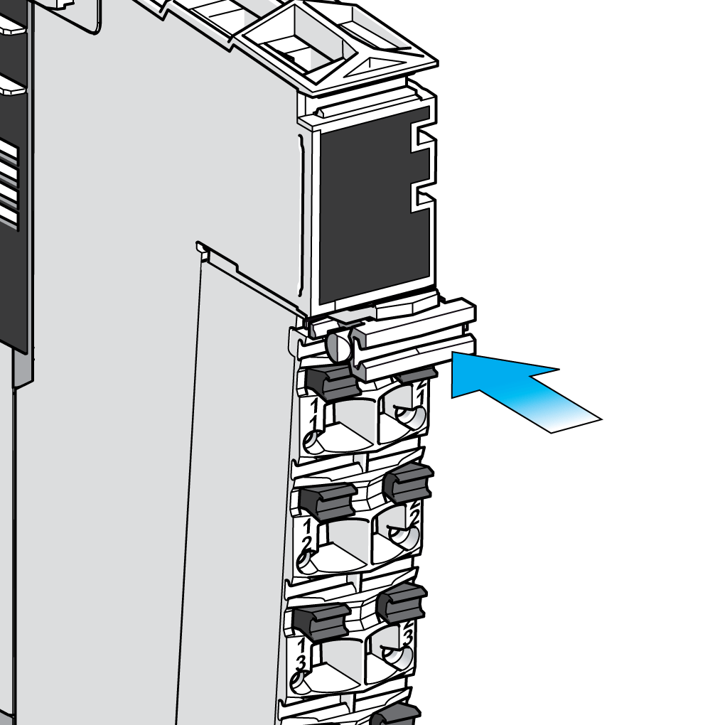 Hang the bottom edge of the terminal block in its hinge on the bus module. |