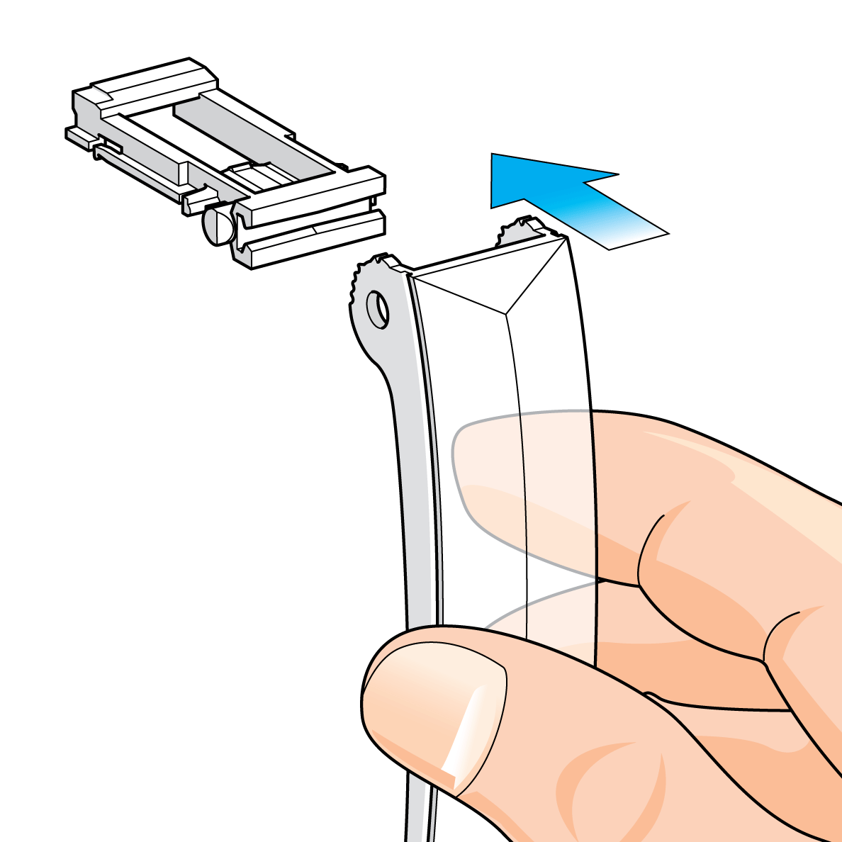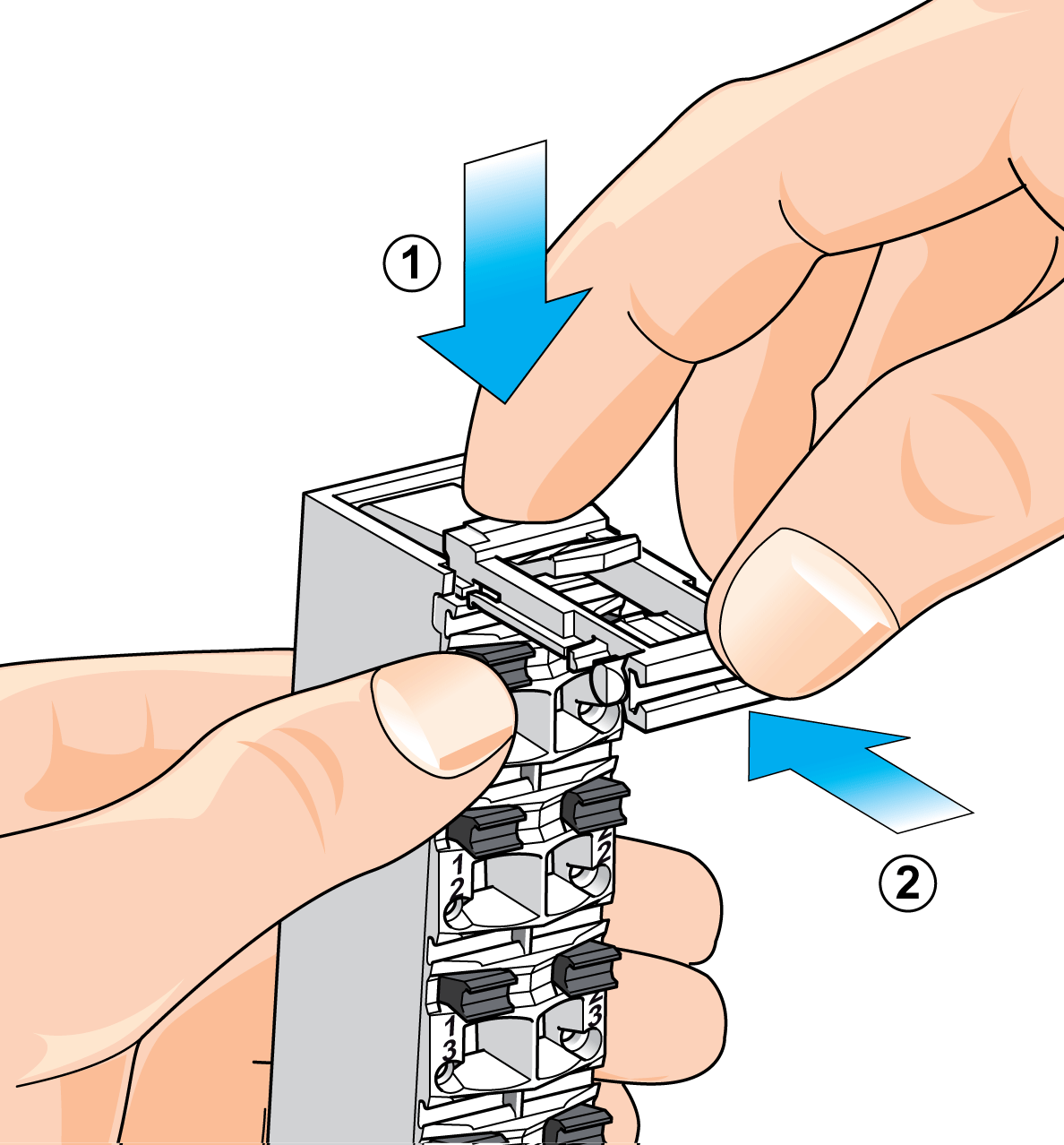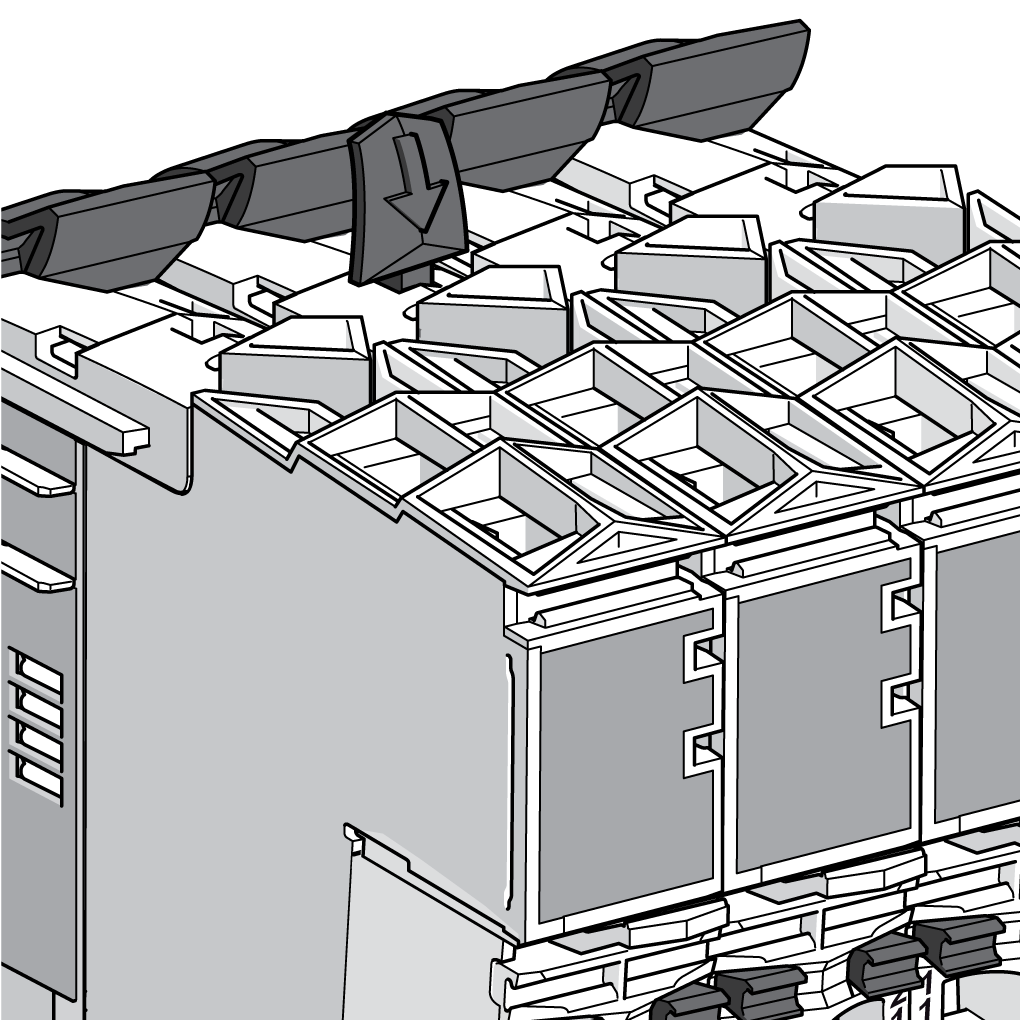 The locking clip attaches the electronic module to the bus base. The locking clip is inserted in the appropriate opening on the top of the slice and pushed down.