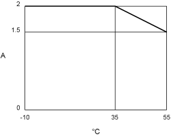 Se puede conseguir un valor de 2 A si se cumplen las restricciones de temperatura. Consulte el siguiente gráfico de reajuste. Si los módulos adyacentes al TM5SDO8TA no disipan más de 1 W, se aplicará este gráfico y la salida de 2 A podrá mantenerse a 35 °C (95 °F).
