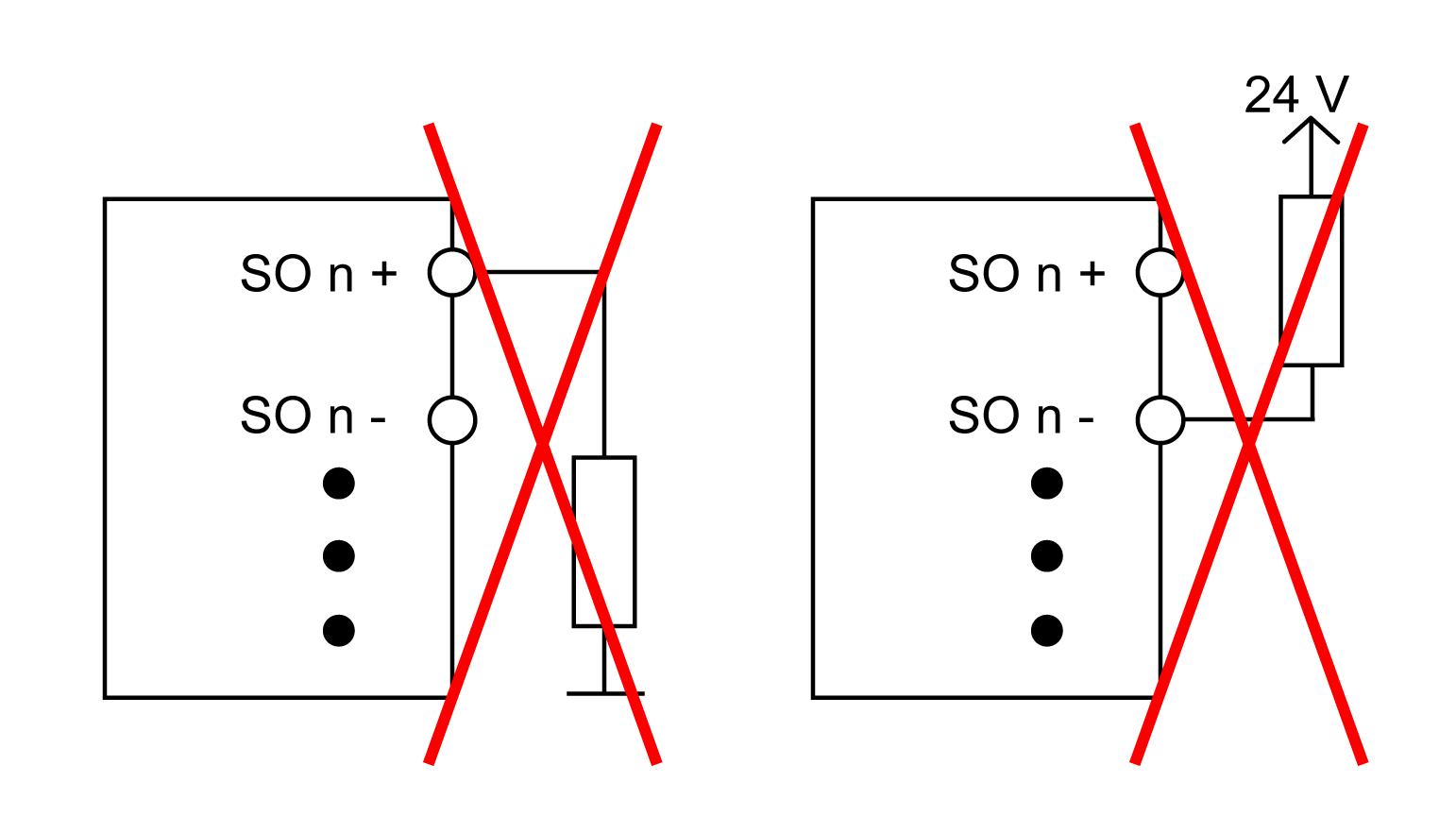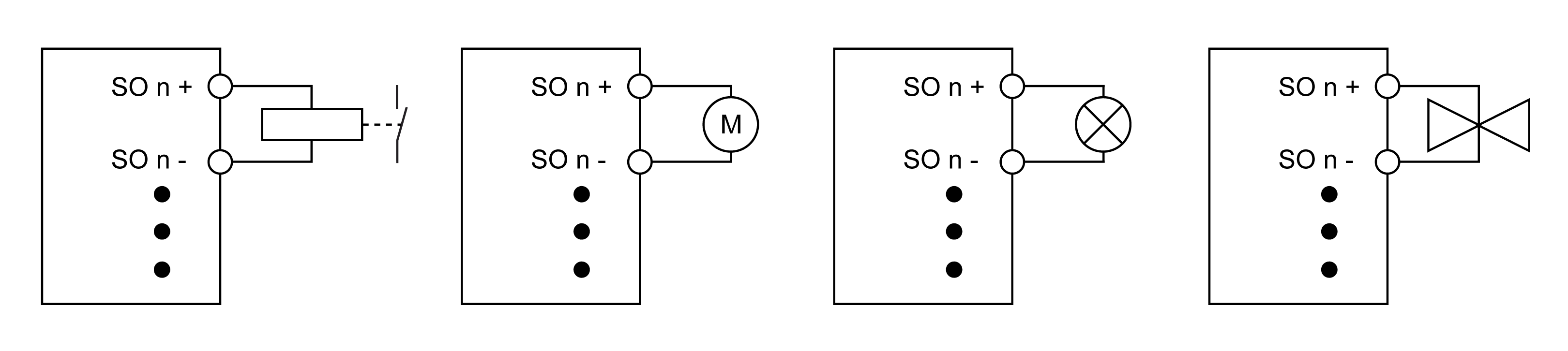 Safety-related actuators (contactors, motors, muting lamps, valves) that are compatible with output module performance data may be connected directly. With this connection, the module corresponds to Category 4 according to EN ISO 13849. This only applies to the module and not to the wiring presented.