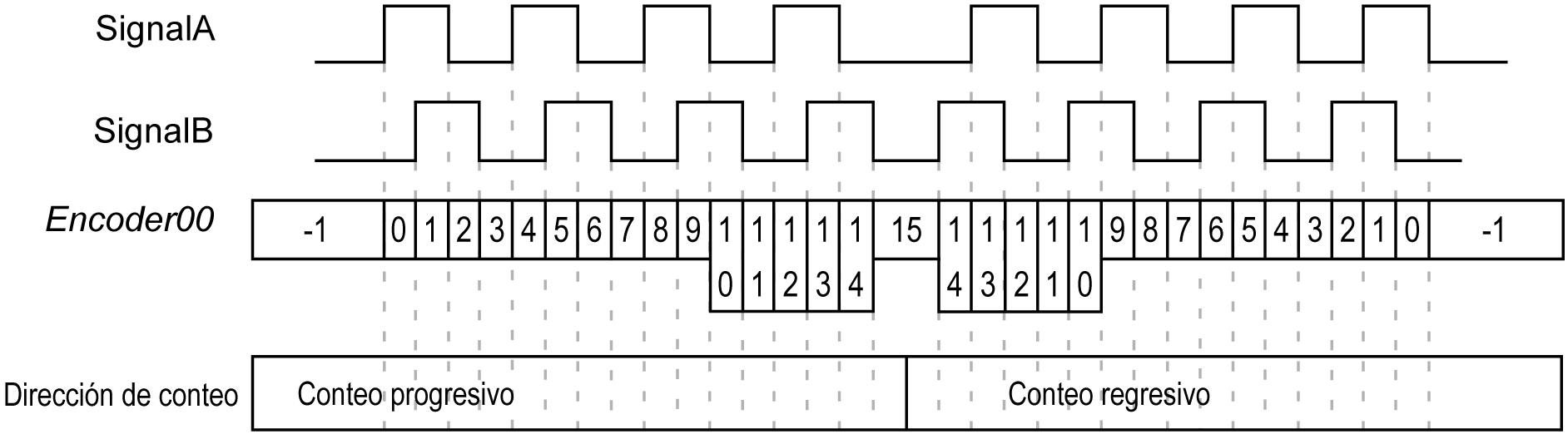 Los bits se cambian continuamente con la configuración de referencia continua. Con cada impulso de referencia, el valor de referencia se aplica al registro Encoder00. |