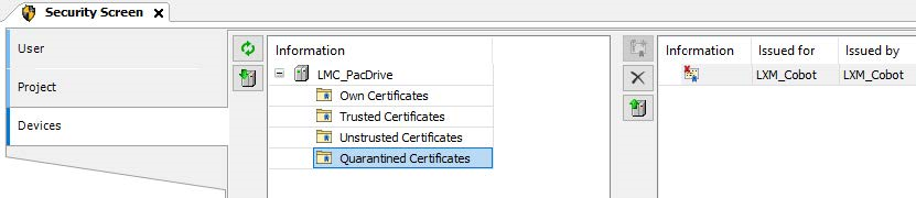 When using the Lexium Cobot communication function blocks with TLS-Encryption, you must save the certificate manually to the trusted certificates.