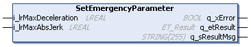 With the method SetEmergencyParameter, the maximum deceleration (change of velocity per time unit) and the maximum absolute jerk (change of deceleration per time unit) are set for emergency stops of the Lexium™ MC multi carrier transport system.