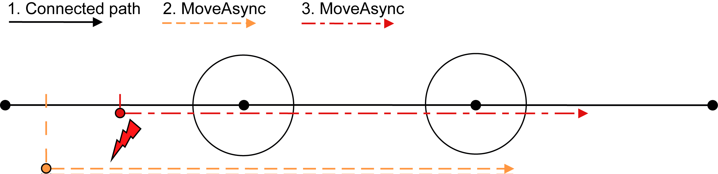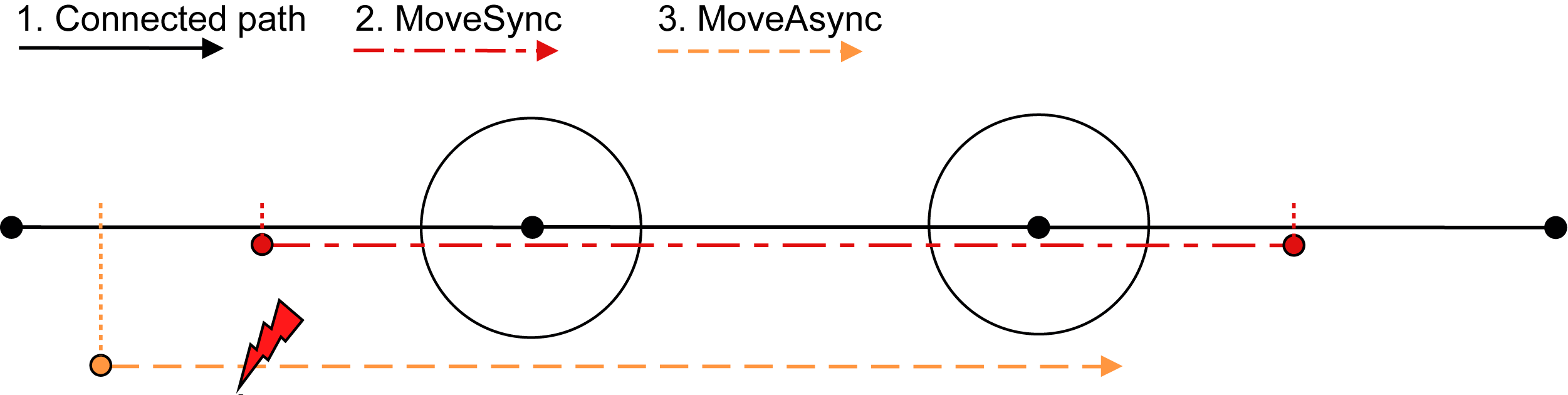 If a move command MoveSync (2.) was sent to the robot, either for the connected path or for a next connected path, it is not possible to send a move command MoveAsync (3.) which starts before the synchronous movement is completed.