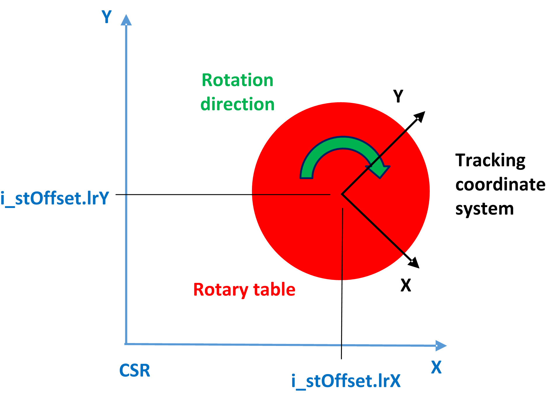 The configuration of a rotative tracking system is similar to a linear tracking system. The parameters i_stOffset, i_etOrientationConvention, and i_stOrientation of the method AddRotativeTrackingSystem describe the origin of the rotative coordinate system based on the CSR (Robot Coordinate System). The origin of the rotative tracking system must be the center of rotation.