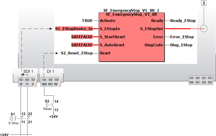 This example illustrates a two-channel equivalent connection of the N/C contacts of an emergency-stop control device with the safety-related SF_EmergencyStop function block. The emergency-stop control device S1 is connected to input terminals I0 and I1 of the safety-related input device SDI with an ID of 1.