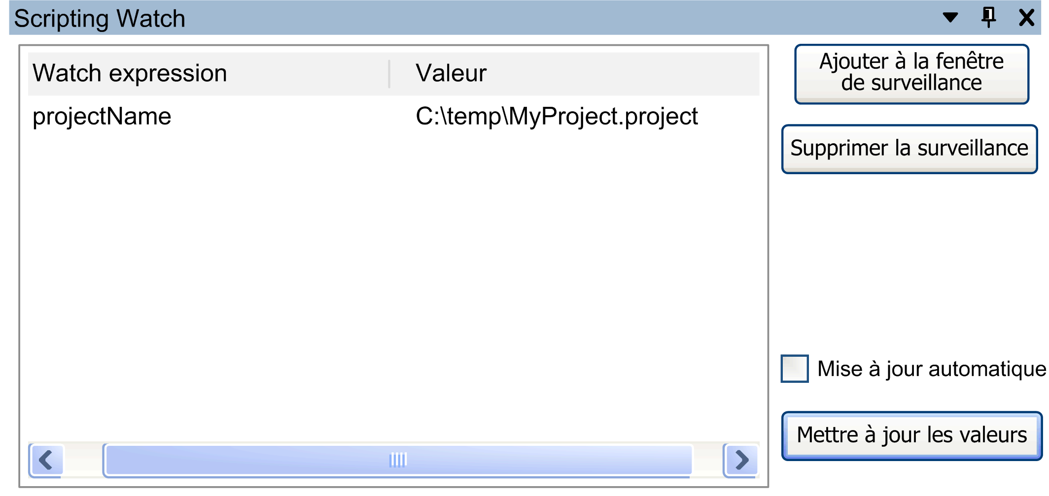 La liste de la vue est mise à jour automatiquement chaque fois qu'une instruction est exécutée dans la vue . Pour mettre à jour la liste manuellement, cliquez sur le bouton . |