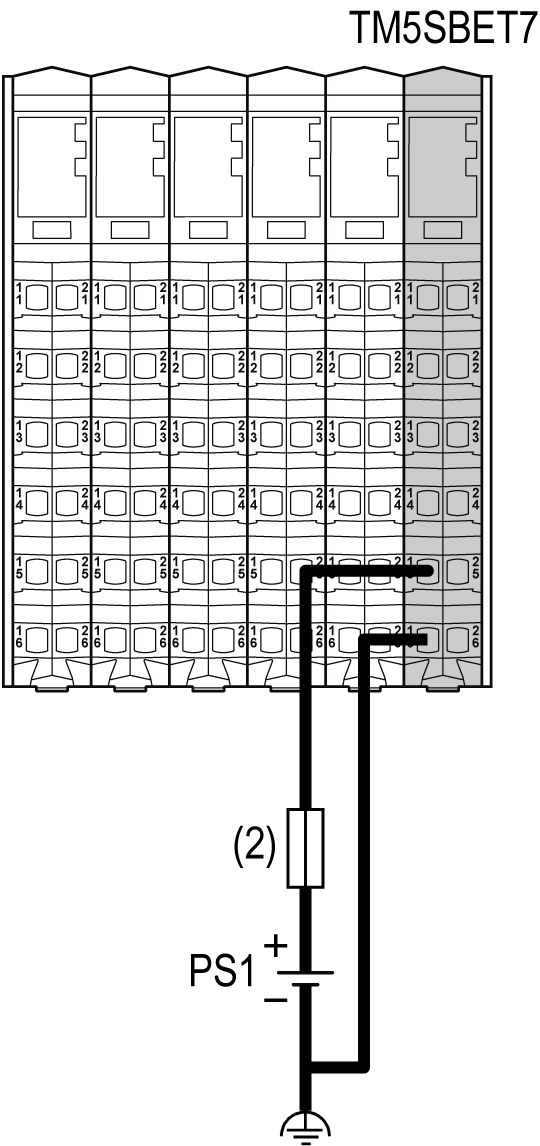 The following figure shows the wiring of the TM5SBET7 wired with one external 24 Vdc power supply: