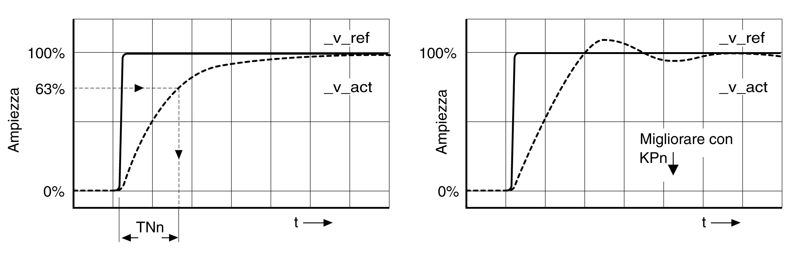 Aumentare o ridurre il coefficiente P a piccoli passi finché _v_act esegue la regolazione nel minor tempo possibile. La figura seguente mostra a sinistra il comportamento del transitorio desiderato. Come illustrato a destra, le sovraelongazione si riducono diminuendo il valore CTRL1_KPn (CTRL2_KPn).