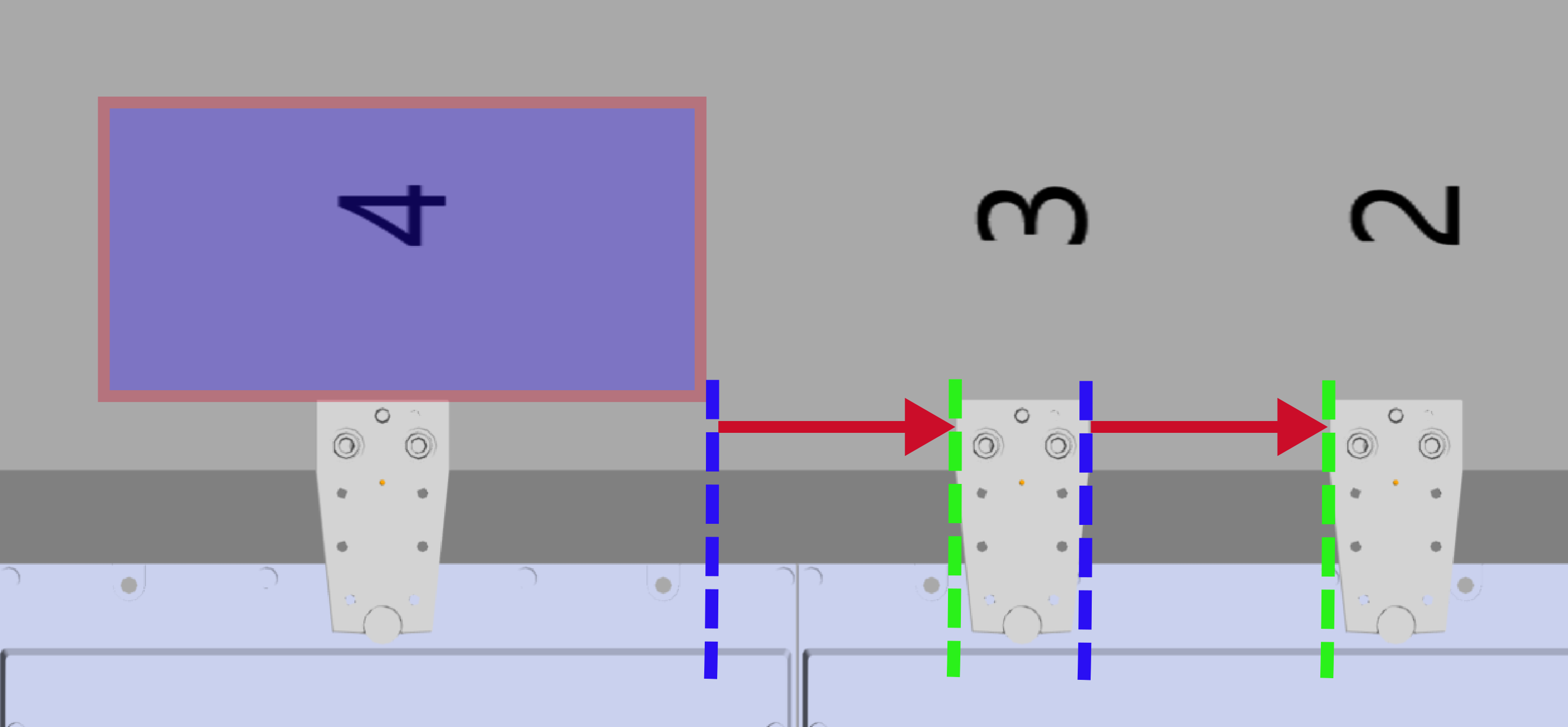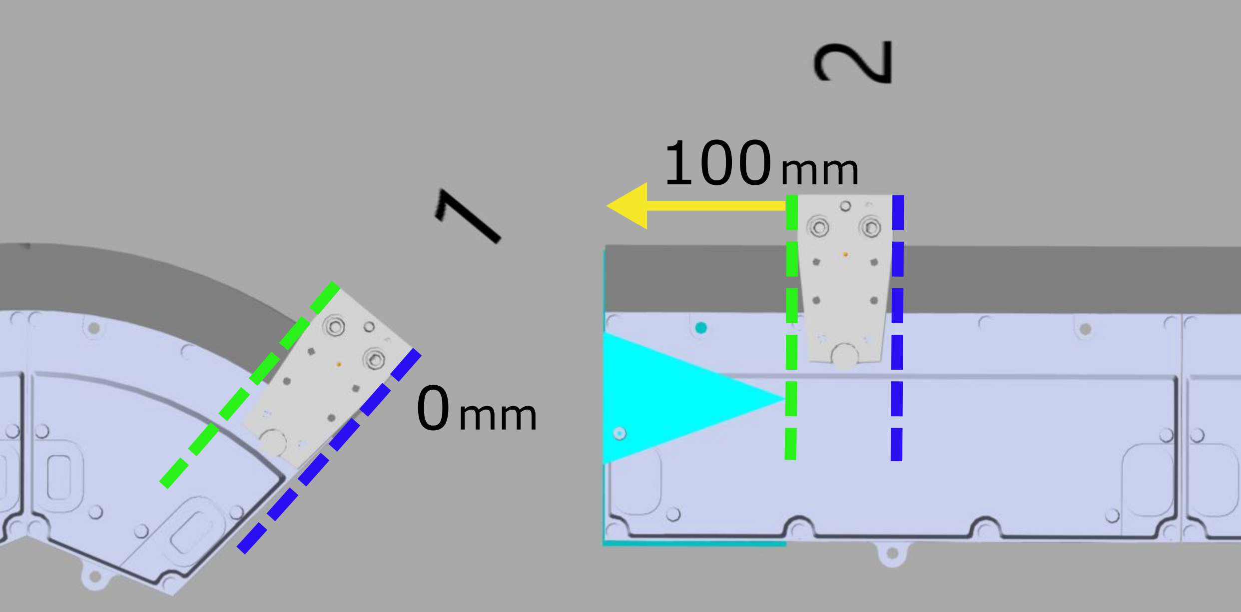 Carrier 3 has to maintain a gap of 100 mm (3.94 in) considering the FrontOffset (blue dotted line) of carrier 3 and the RearOffset (green dotted line) of carrier 2.