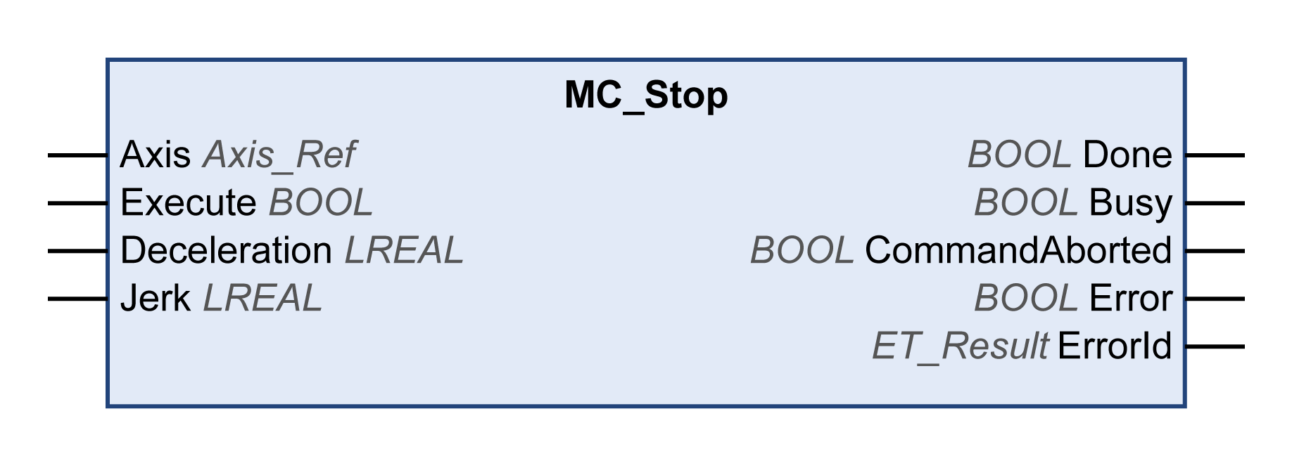 Questo blocco funzione interrompe il movimento in corso. Non è possibile avviare altri movimenti finché questo blocco funzione è attivo. Vedere MC_Halt per uno stop che può essere interrotto.