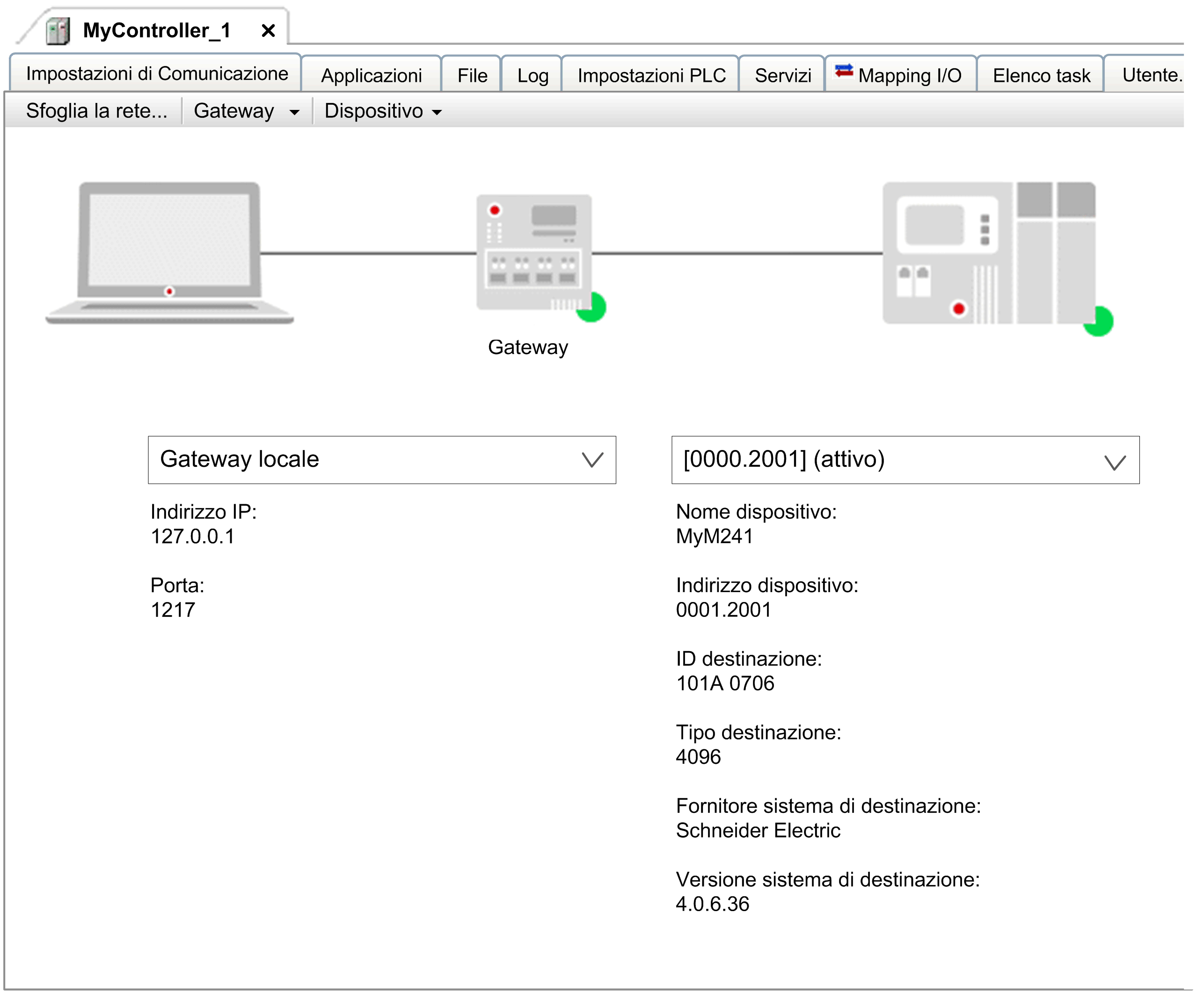 La scheda finestra di dialogo e fornisce una vista grafica per configurare i parametri per la comunicazione tra dispositivo e sistema di programmazione.