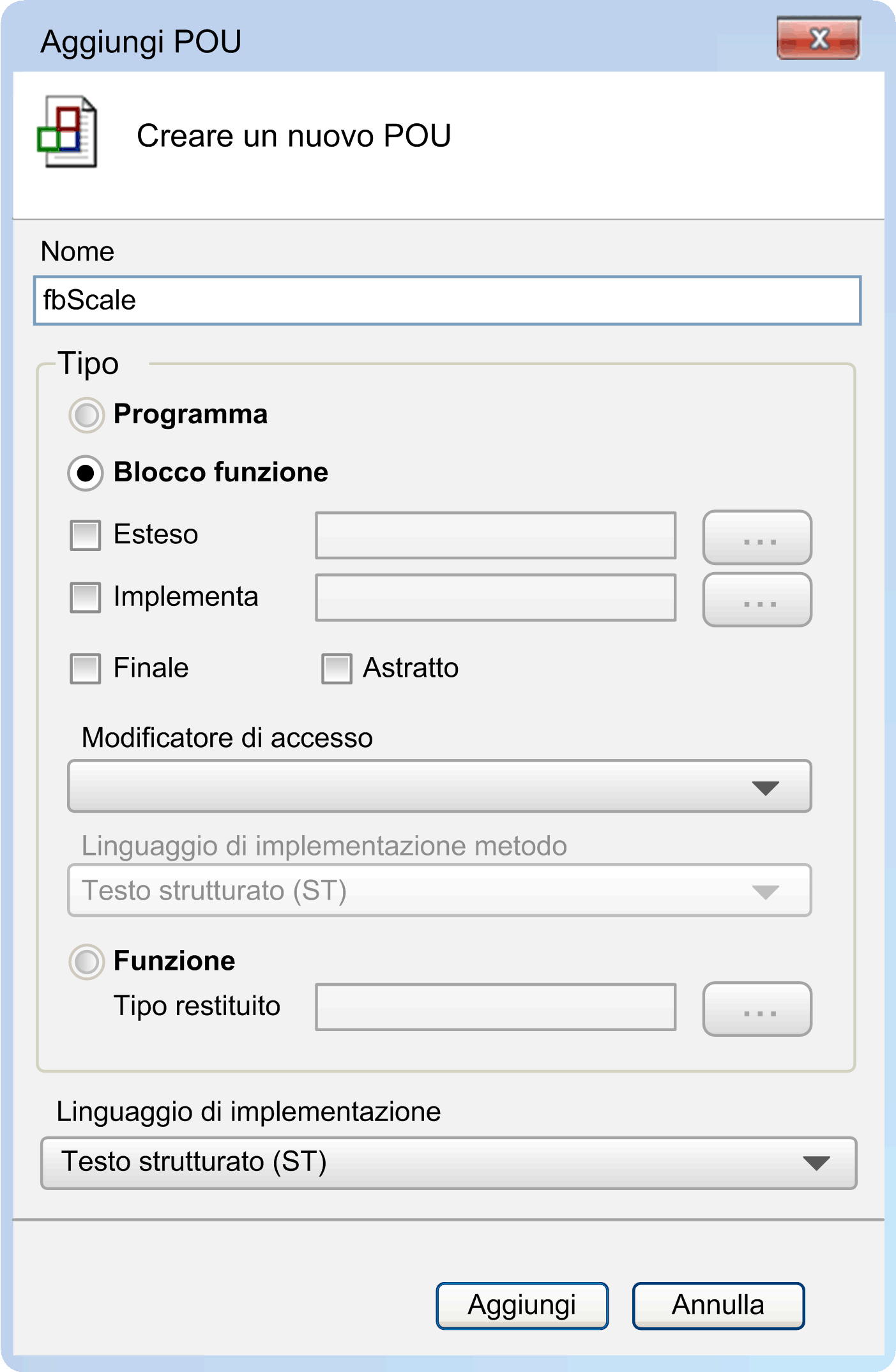 Selezionare il tipo di oggetto POU desiderato: