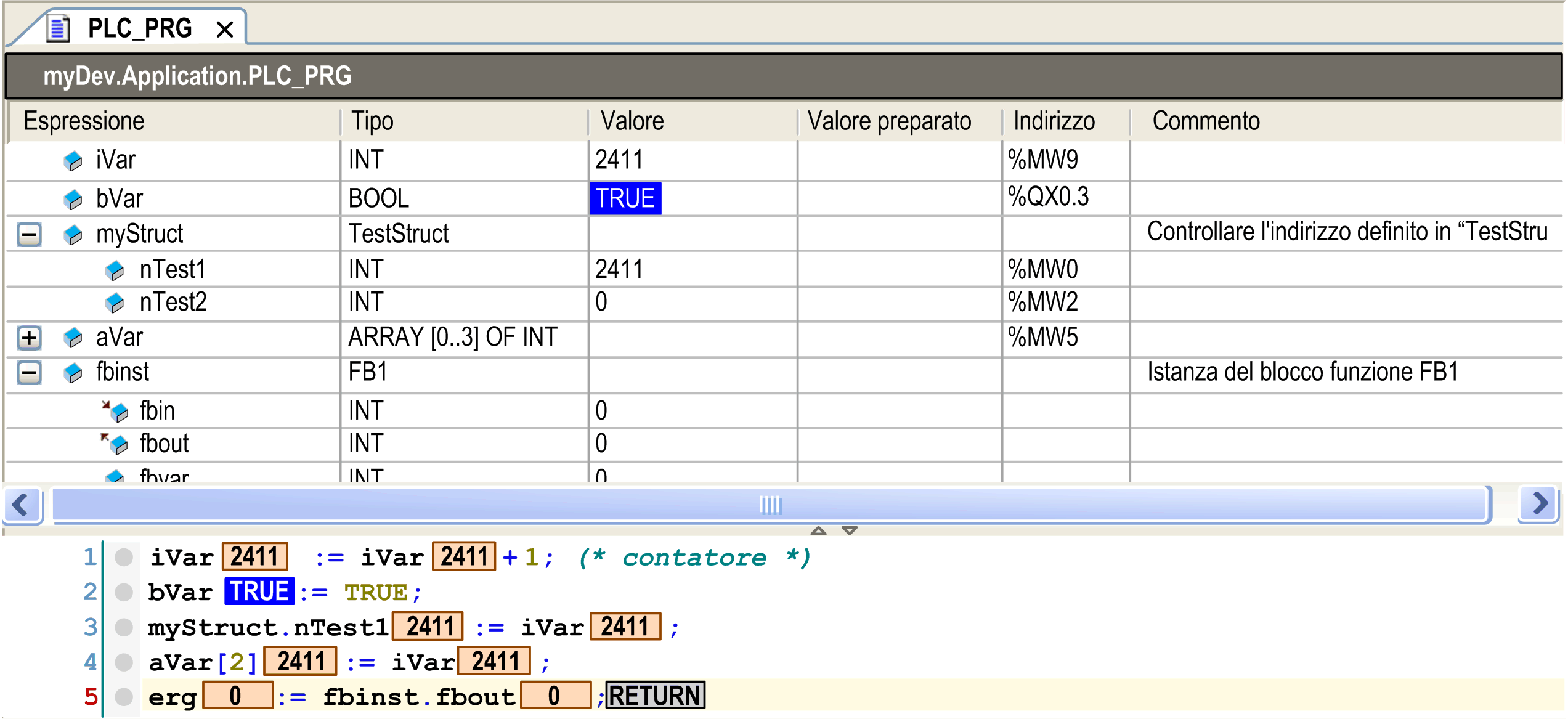 Se un'espressione di controllo (variabile) è di tipo strutturato, ad esempio, un'istanza di un blocco funzione o una variabile di array, un segno più o meno precede l'espressione. Facendo clic con il mouse su questo segno, è possibile ulteriormente visualizzare (vedere fbinst