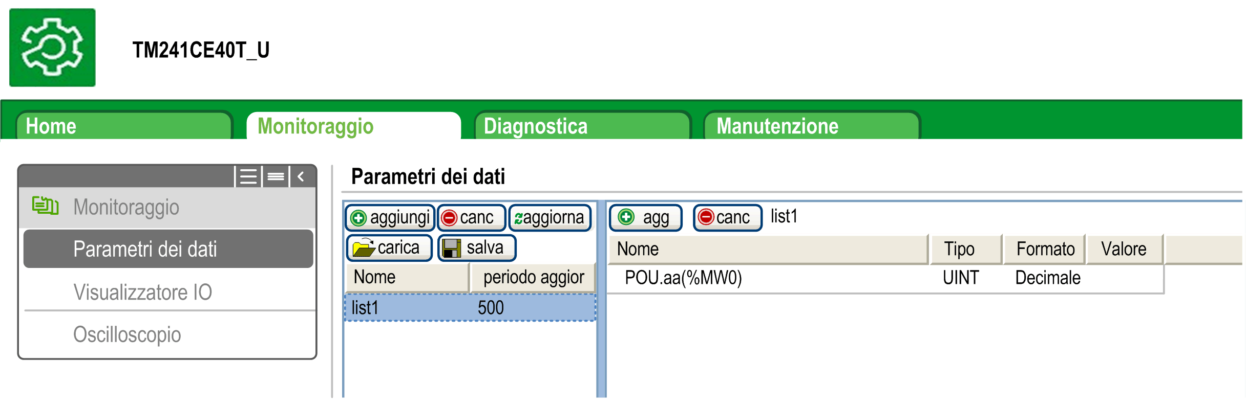 consente di creare e monitorare alcuni elenchi di variabili. Si possono creare varie liste di variabili (max. 10), ognuna delle quali contiene diverse variabili dell'applicazione del controller (max. 20 variabili per elenco).Ogni elenco ha un nome e un periodo di aggiornamento. Gli elenchi vengono salvati nella memoria non volatile del controller, in modo che sia possibile accedere a un elenco creato (caricato, modificato, salvato) da qualsiasi applicazione client Web che accede a questo controller.