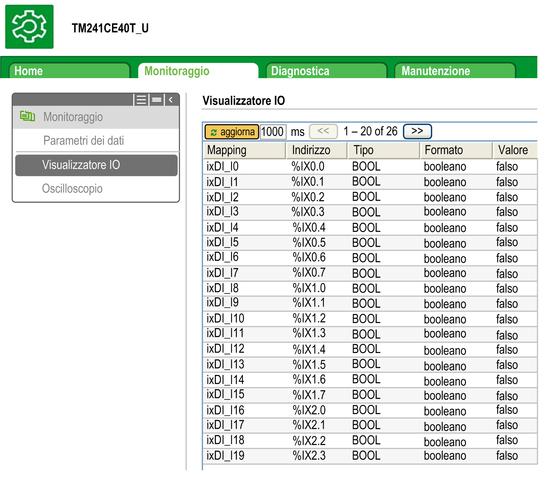 visualizza lo stato dello scanner degli I/OPer ulteriori informazioni, vedere EcoStruxure Machine Expert Modbus TCP - Guida utente.
