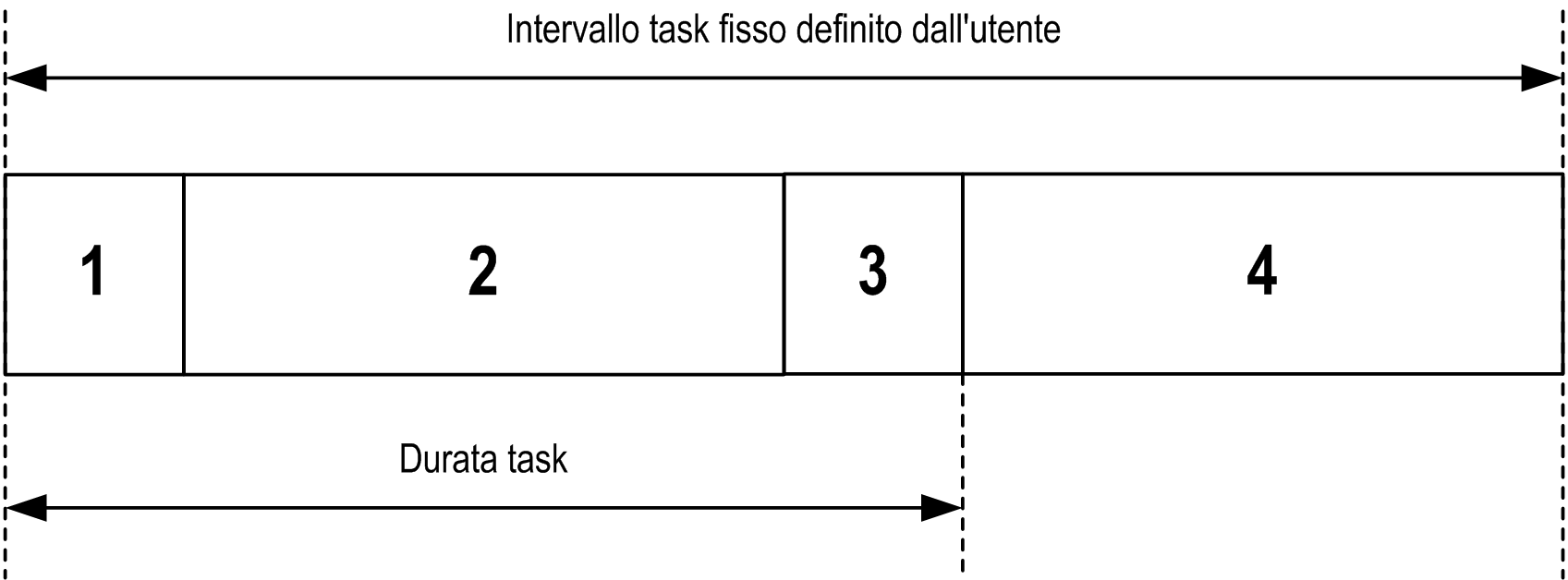 A un task ciclico viene assegnato un tempo di ciclo fisso utilizzando l'impostazione dell'intervallo nella sezione di tipo della sottoscheda di configurazione per quel task. Ogni tipo di task ciclico viene eseguito come indicato di seguito: