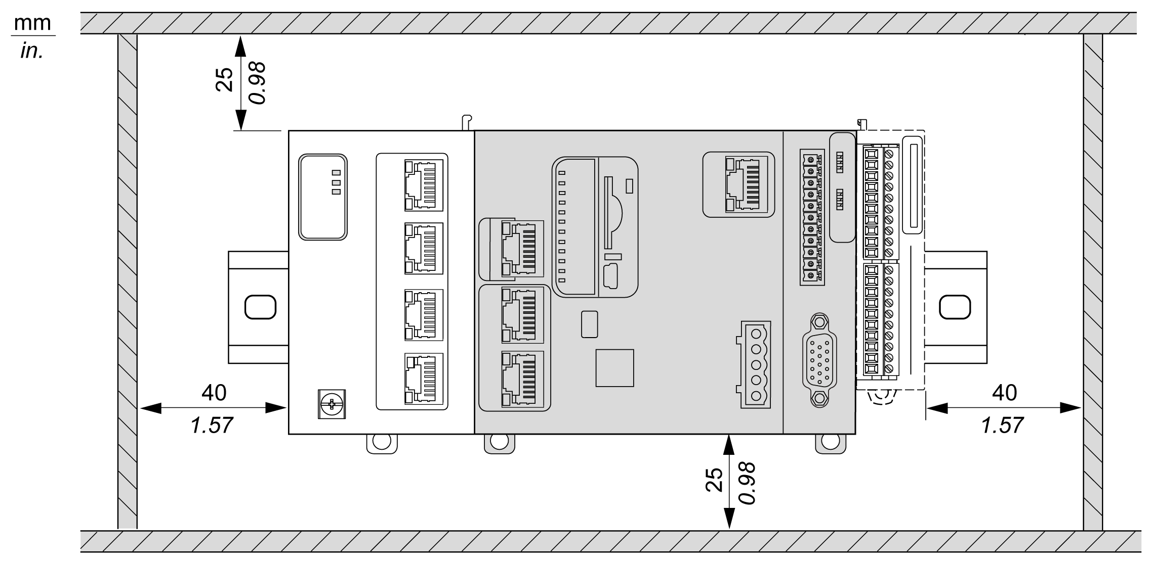 Il M262 Logic/Motion Controller è stato progettato come un prodotto IP20 e deve essere installato in un cabinet. Nell'installazione del prodotto occorre rispettare le distanze minime indicate.