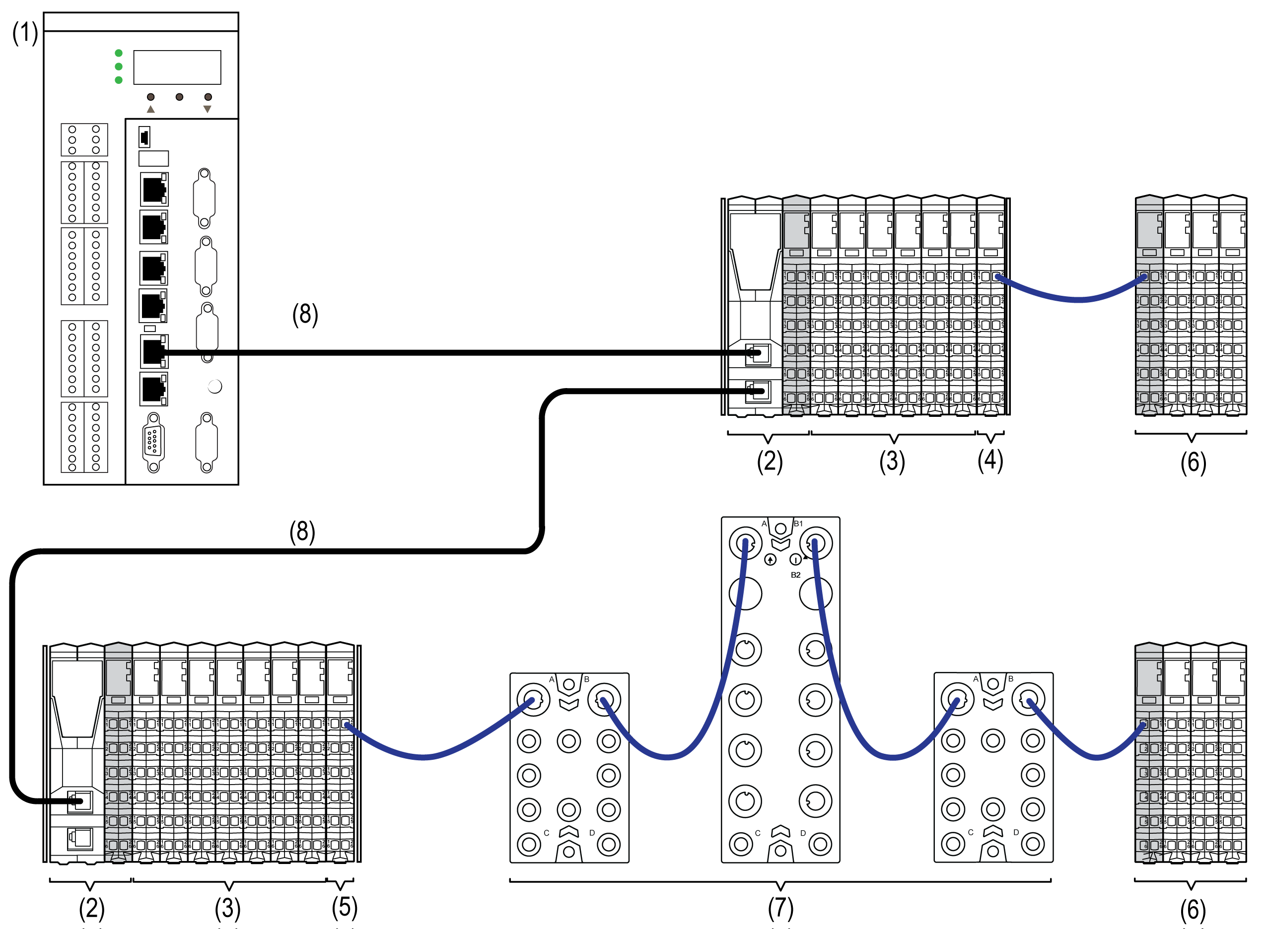 The following figure represents TM5 / TM7 System I/Os connected via Sercos III bus to a Logic Motion Controller (1):