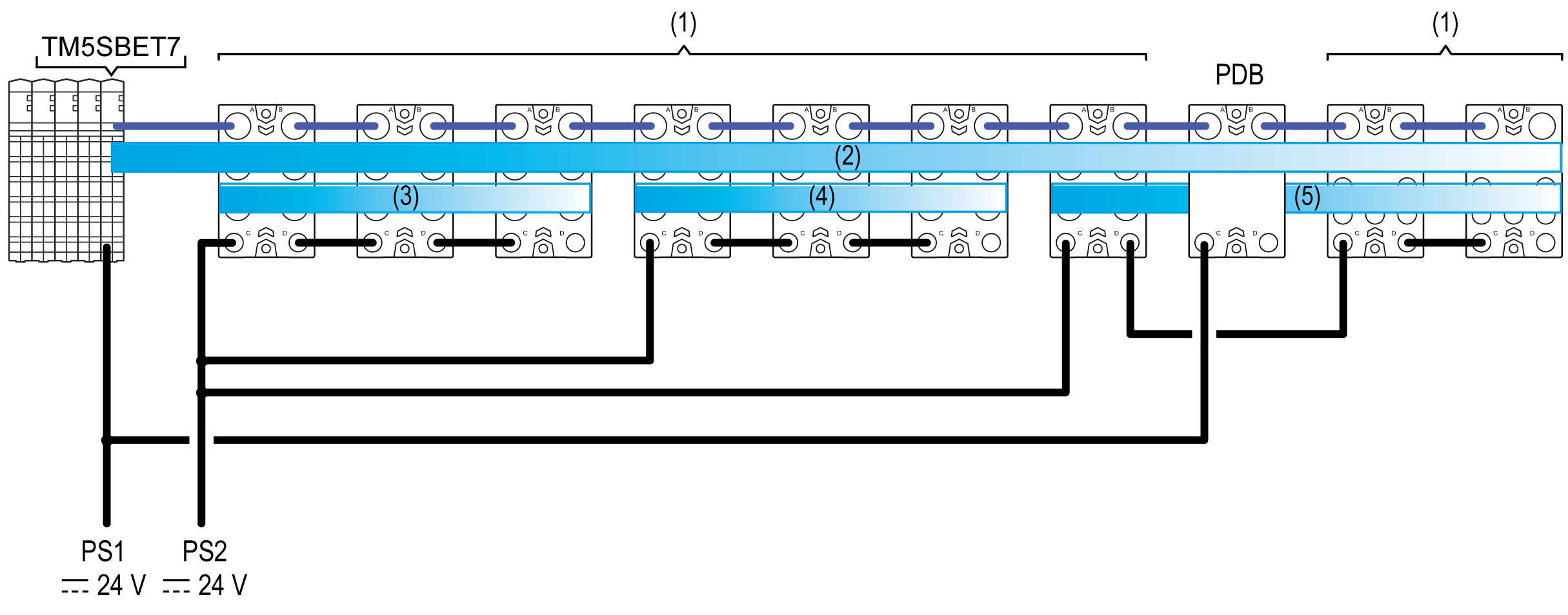 Altri componenti generano tensione aggiuntiva per il bus di alimentazione TM7 o distribuiscono l'energia per creare segmenti di alimentazione degli I/O a 24 Vcc separati. Ad esempio, si possono aggiungere blocchi di distribuzione dell'alimentazione (PDB) per fornire tensione supplementare al bus di alimentazione TM7, se necessario per la configurazione di I/O. Oppure si può collegare un alimentatore a un blocco di I/O per dividere il segmento di alimentazione di I/O a 24 Vcc in più segmenti di alimentazione di I/O a 24 Vcc separati.