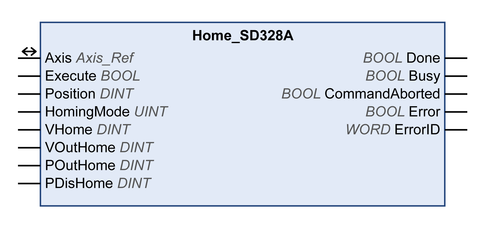 返回诊断代码值。请参阅库诊断代码。如果值为 0 且此功能块的输出 Error 设置为 TRUE,则可利用功能块 MC_ReadAxisError 的输出 AxisErrorID 读取诊断代码。 |