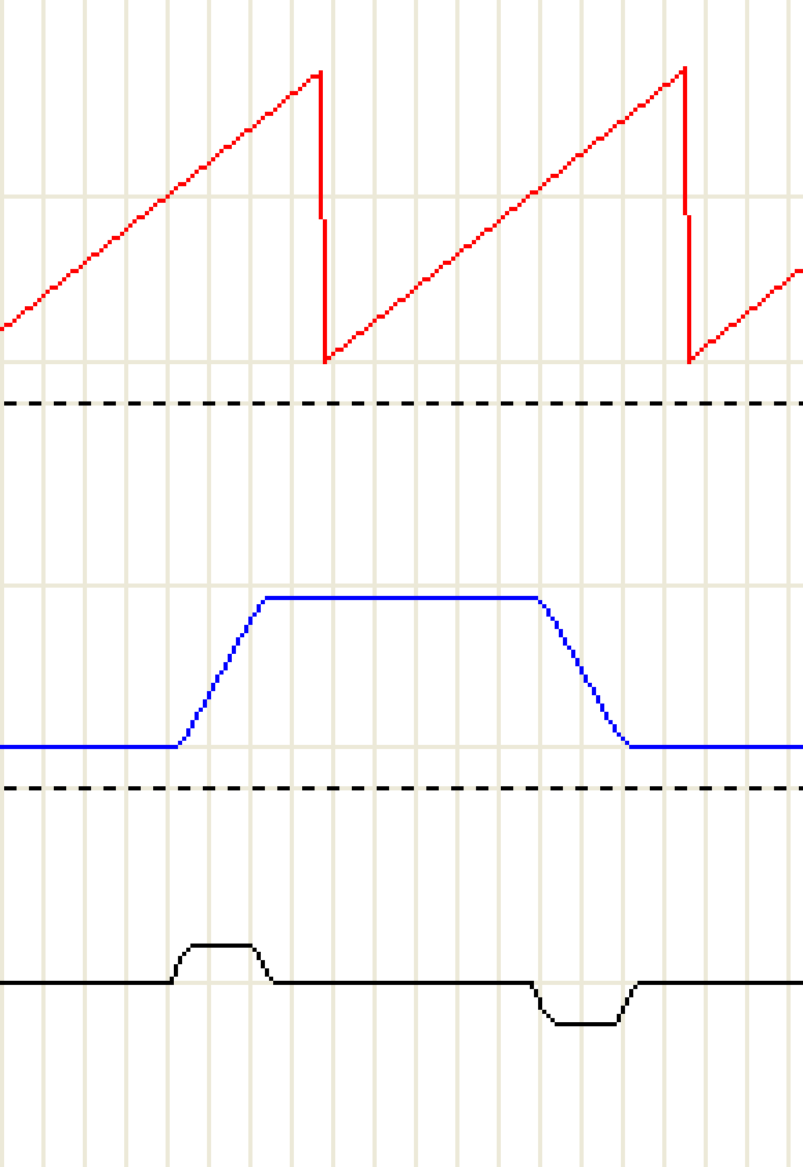The following graphical illustration shows three different gear factors and their effect on velocity and acceleration of the trains. At the topmost position the position of the master is marked in red. Then the velocity of the trains in blue, and finally the acceleration of the trains in black.