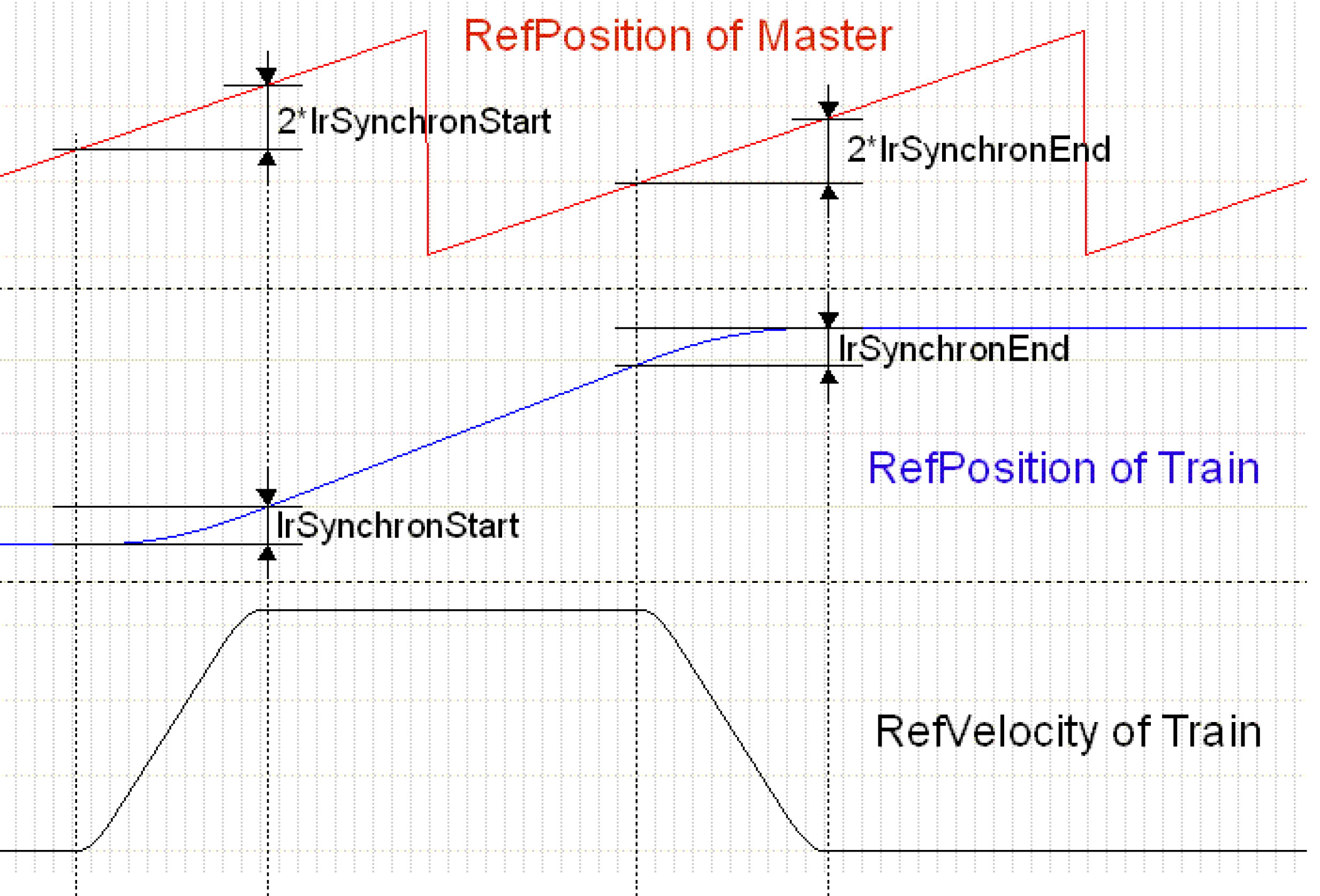 The parameters ST_Synchron.lrSynchronStart and ST_Synchron.lrSynchronEnd define the ramp by means of which the trains accelerate to master velocity or decelerate from master velocity to 0. The parameters provide the path which the train travels during acceleration. The master travels twice the distance during the acceleration phase. Normally both values should be equal so that a symmetrical motion is generated. During loading and unloading, the trains travel with these preset ramps. Even compensation motions will be executed by means of these ramps.