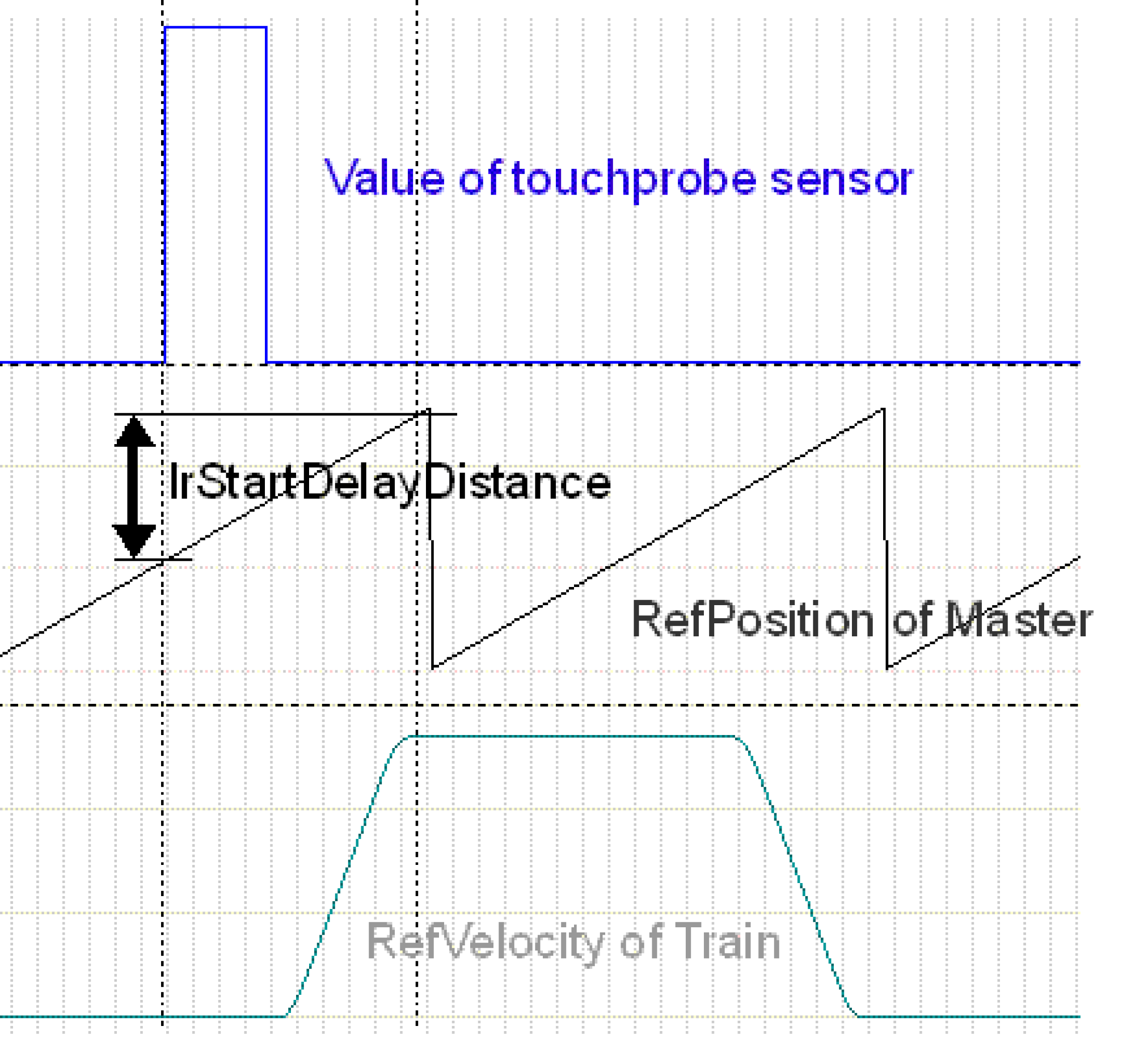 The graphical illustration shows the Touchprobe sensor (at the top), which detects the product. The sensor detects a product, and after the master has moved on by ST_Synchron.lrStartDelayDistance, the train has reached the synchronous phase. Thus, the measurement is not carried out until the start of the motion, but until the start of the synchronous phase. This allows the start ramp to be changed without adapting ST_Synchron.lrStartDelayDistance. ST_Synchron.lrStartDelayDistance is measured in units of the master.