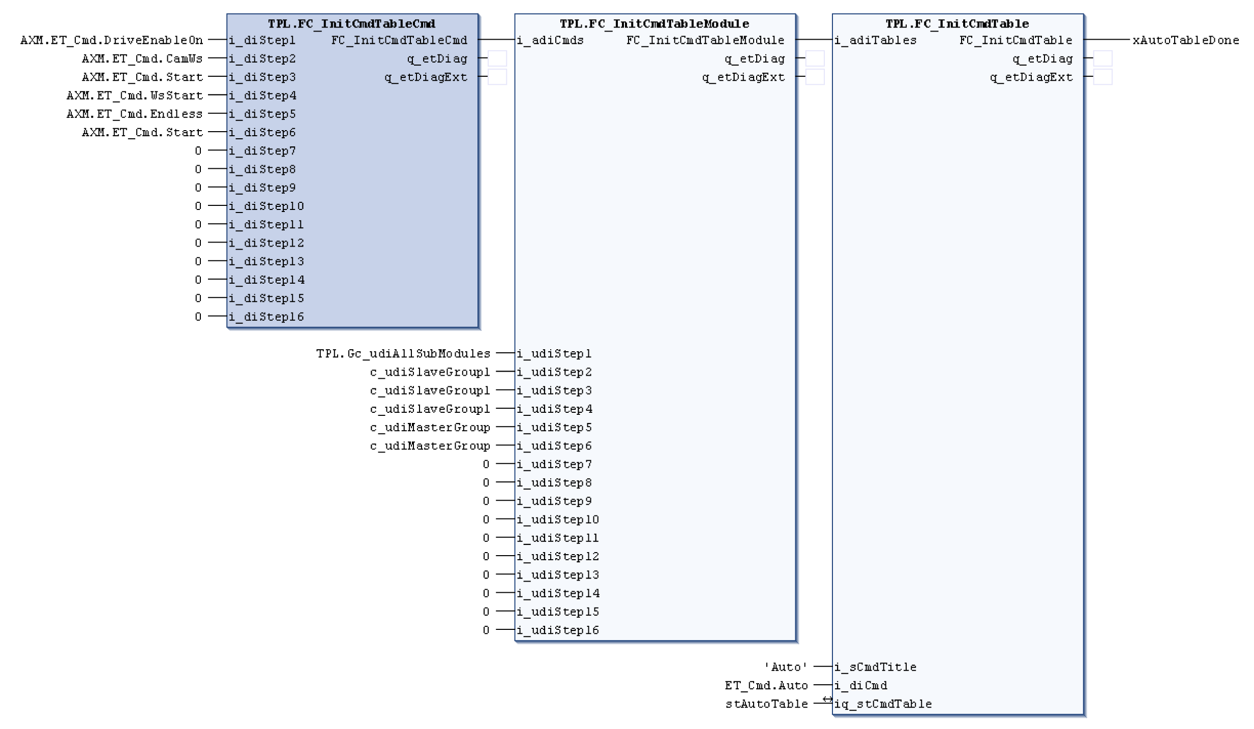 This function assigns command to a command table. An axis or a group of axes holds commands such as "start homing". A command table is an ordered list of commands that the AXM.FC_AxisModuleController function block uses to command an axis or a group of axes.
