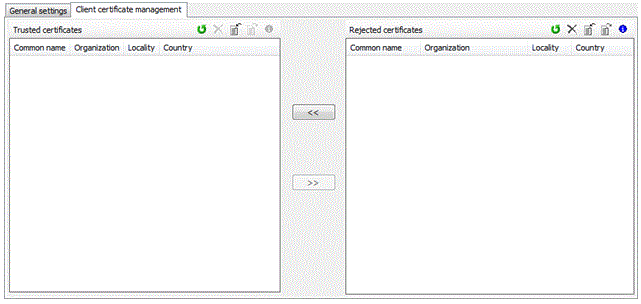 This tab allows you to determine which client certificates are trusted and which clients are allowed to communicate with the server.
