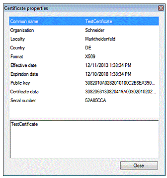 Opens a dialog box containing additional information on the selected certificate. ![]() |