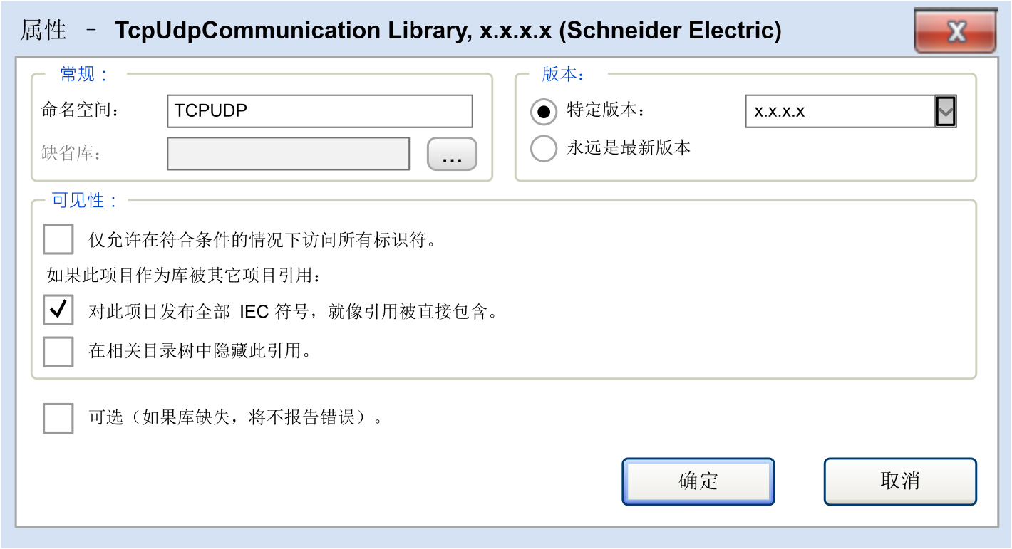 在编辑器视图中,单击按钮以打开所选库的对话框。通过此对话框,可以配置库引用的命名空间、版本处理、可用性和可见性。
