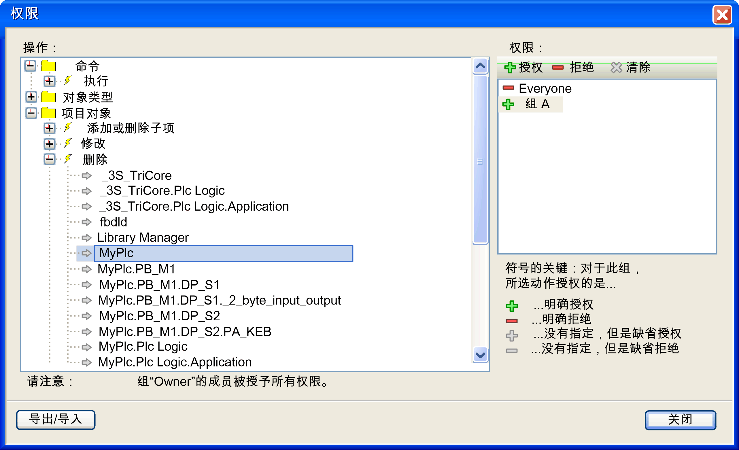命令可打开对话框,此对话框用于配置在已打开的项目中使用对象来执行命令或修改用户管理配置的权限。与对象有关的权限也可在对象的属性对话框中进行配置。