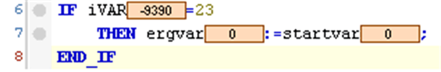 可能的断点位置取决于编辑器。基本上,它们是 POU 中变量的值可发生改变的位置,或者是程序流程产生分支或调用另一个 POU 的位置。